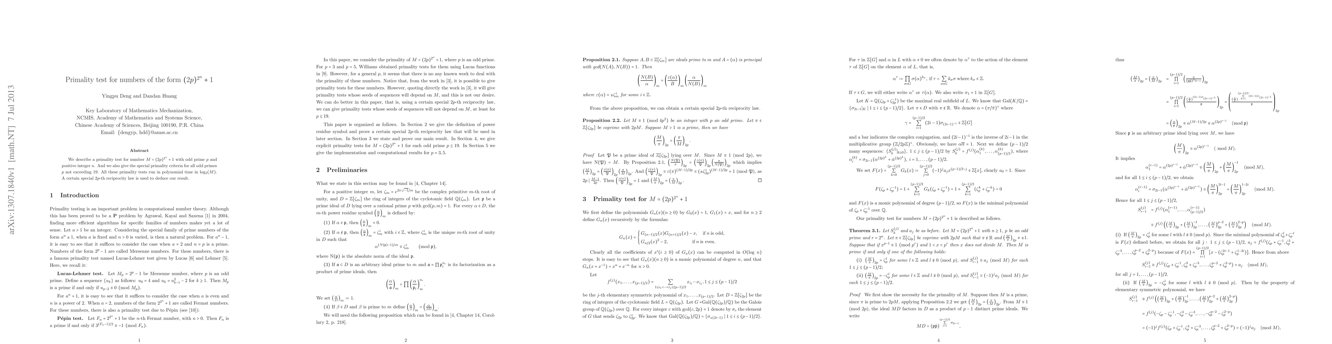 This paper presents a polynomial-time primality test for numbers of the form $(2p)^{2^n}+1$ with odd prime $p$ and positive integer $n$, leveraging a special $2p$-th reciprocity law. It also provides specific criteria for odd primes $p$ up to 19.