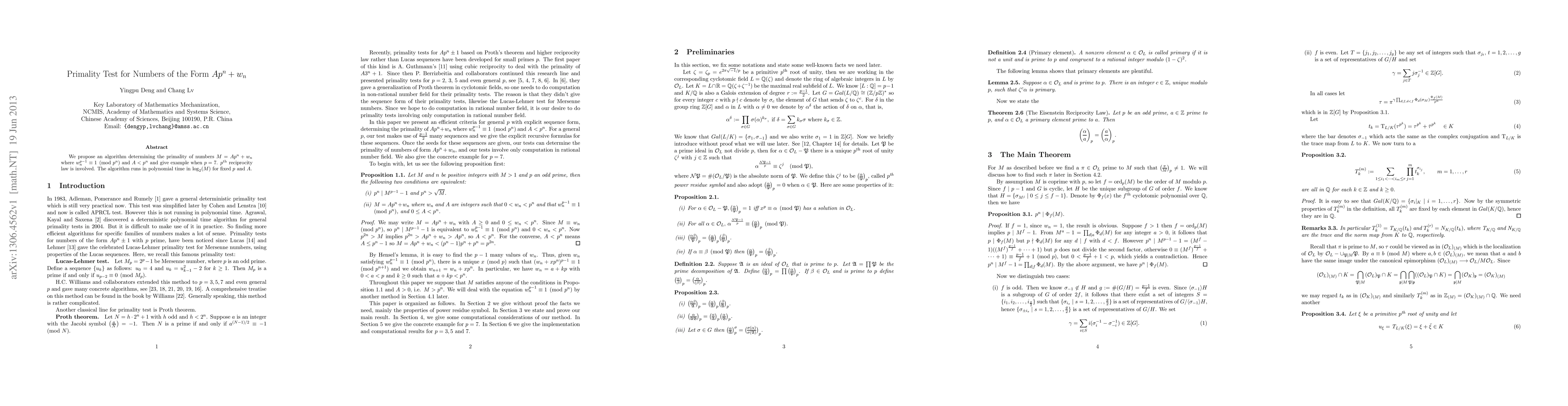 This paper proposes a polynomial-time algorithm for testing the primality of numbers of the form $M=Ap^n+w_n$, where $w_n$ satisfies $w_n^{p-1}\equiv1\pmod{p^n}$ and $A<p^n$, using the $p$th reciprocity law. An example is provided for $p=7$.