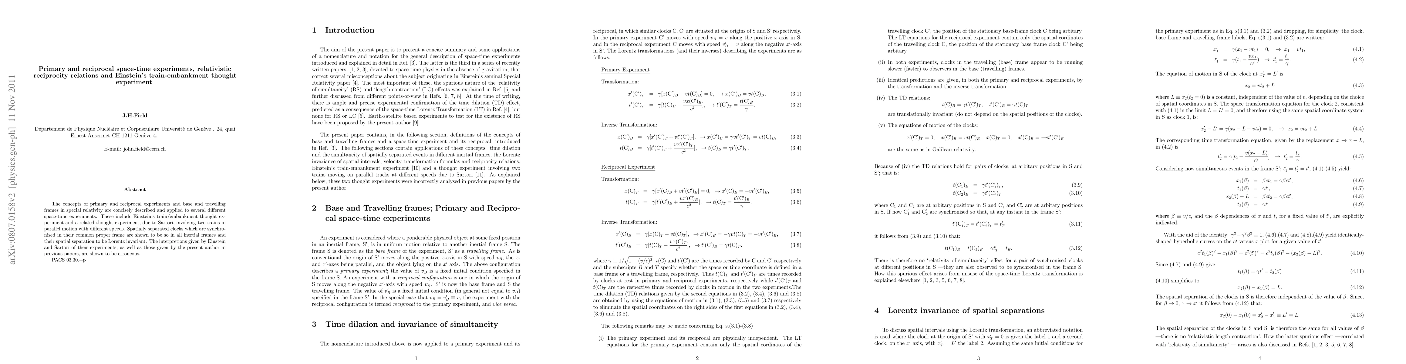The concepts of primary and reciprocal experiments and base and travelling frames in special relativity are concisely described and applied to several different space-time experiments. These include Einstein's train/embankment thought experiment and a related thought experiment, due to Sartori, involving two trains in parallel motion with different speeds. Spatially separated clocks which are synchronised in their common proper frame are shown to be so in all inertial frames and their spatial separation to be Lorentz invariant. The interpretions given by Einstein and Sartori of their experiments, as well as those given by the present author in previous papers, are shown to be erroneous.