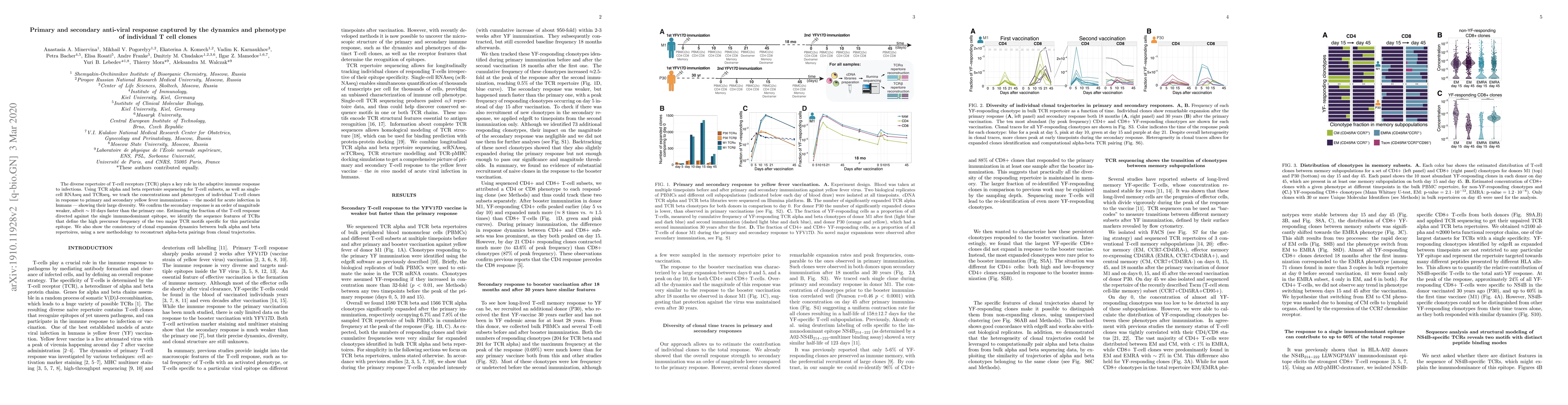 The diverse repertoire of T-cell receptors (TCR) plays a key role in the adaptive immune response to infections. Previous studies show that secondary responses to the yellow fever vaccine - the model for acute infection in humans - are weaker than primary ones, but only quantitative measurements can describe the concentration changes and lineage fates for distinct T-cell clones in vivo over time. Using TCR alpha and beta repertoire sequencing for T-cell subsets, as well as single-cell RNAseq and TCRseq, we track the concentrations and phenotypes of individual T-cell clones in response to primary and secondary yellow fever immunization showing their large diversity. We confirm the secondary response is an order of magnitude weaker, albeit $\sim10$ days faster than the primary one. Estimating the fraction of the T-cell response directed against the single immunodominant epitope, we identify the sequence features of TCRs that define the high precursor frequency of the two major TCR motifs specific for this particular epitope. We also show the consistency of clonal expansion dynamics between bulk alpha and beta repertoires, using a new methodology to reconstruct alpha-beta pairings from clonal trajectories.