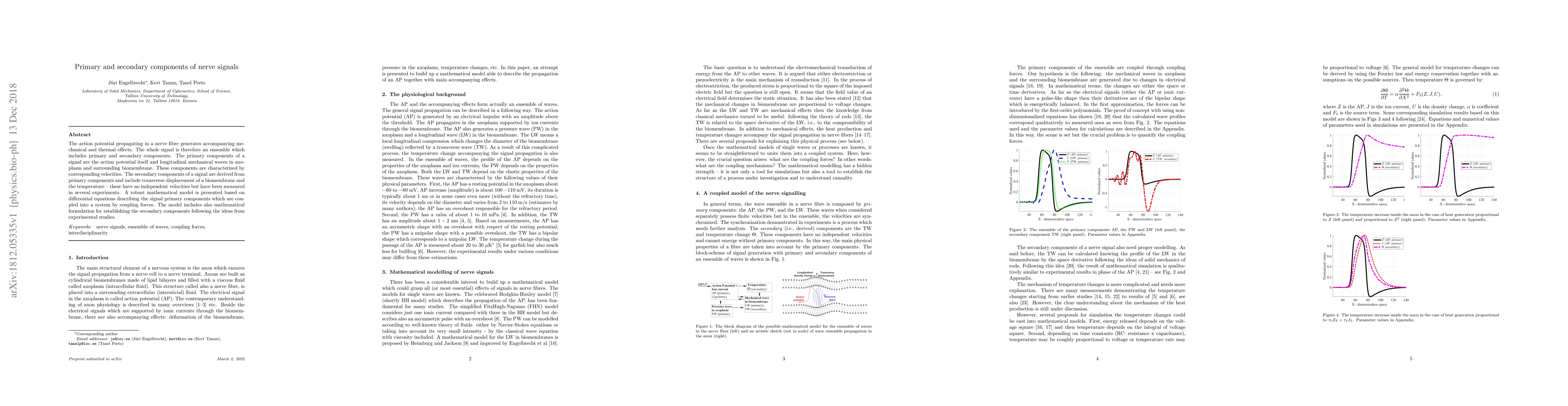 This paper presents a mathematical model describing the primary and secondary components of nerve signals, including the action potential and associated mechanical waves, alongside secondary effects like membrane displacement and temperature changes. The model uses differential equations to capture the dynamics of these components and their interactions.