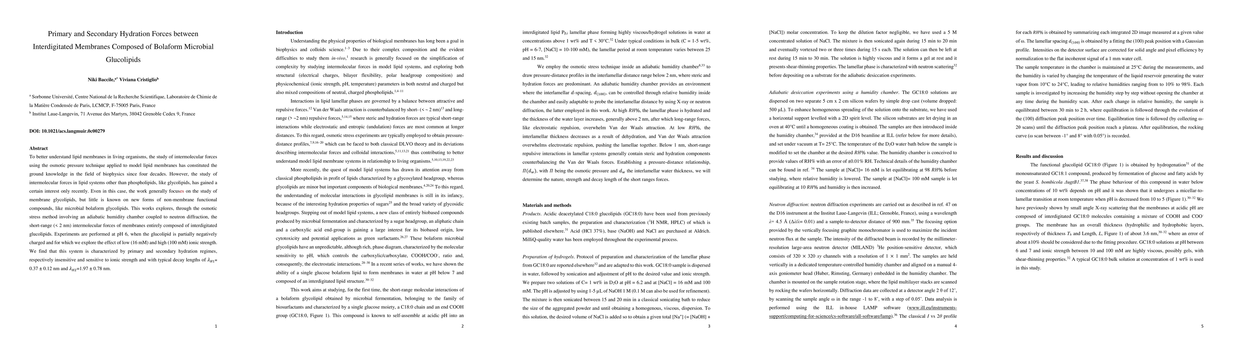 This study investigates the short-range intermolecular forces between interdigitated membranes composed of bolaform microbial glucolipids using osmotic pressure and neutron diffraction. It reveals primary and secondary hydration forces with decay lengths of 0.37 nm and 1.97 nm, respectively, showing distinct ionic strength sensitivity.