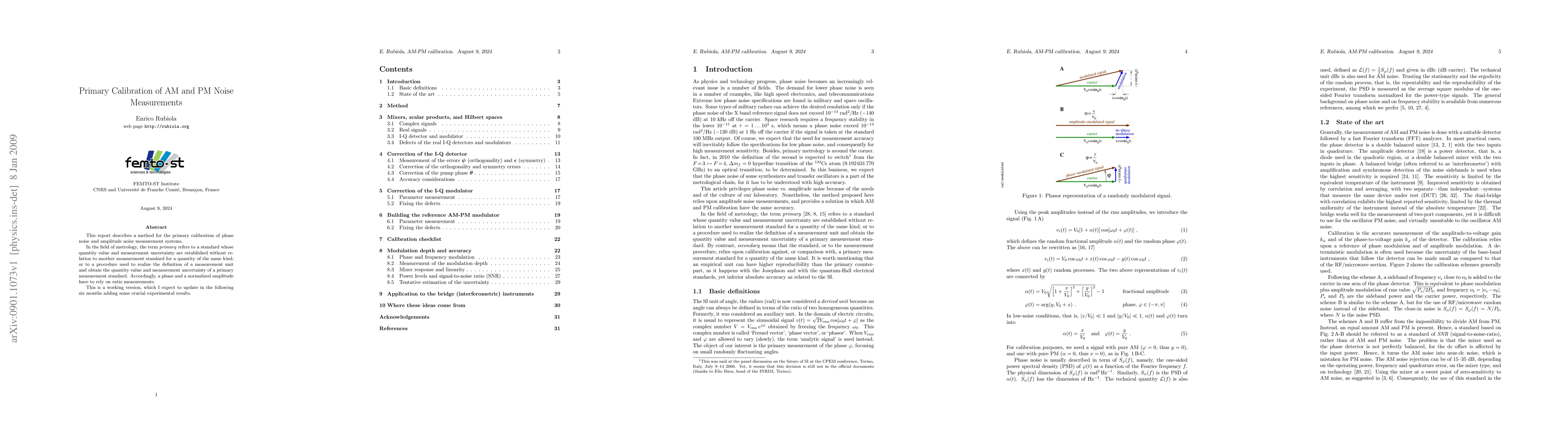 This report describes a method for the primary calibration of phase noise and amplitude noise measurement systems. In the field of metrology, the term "primary" refers to a standard whose quantity value and measurement uncertainty are established without relation to another measurement standard for a quantity of the same kind; or to a procedure used to realize the definition of a measurement unit and obtain the quantity value and measurement uncertainty of a primary measurement standard. Accordingly, a phase and a normalized amplitude have to rely on ratio measurements.