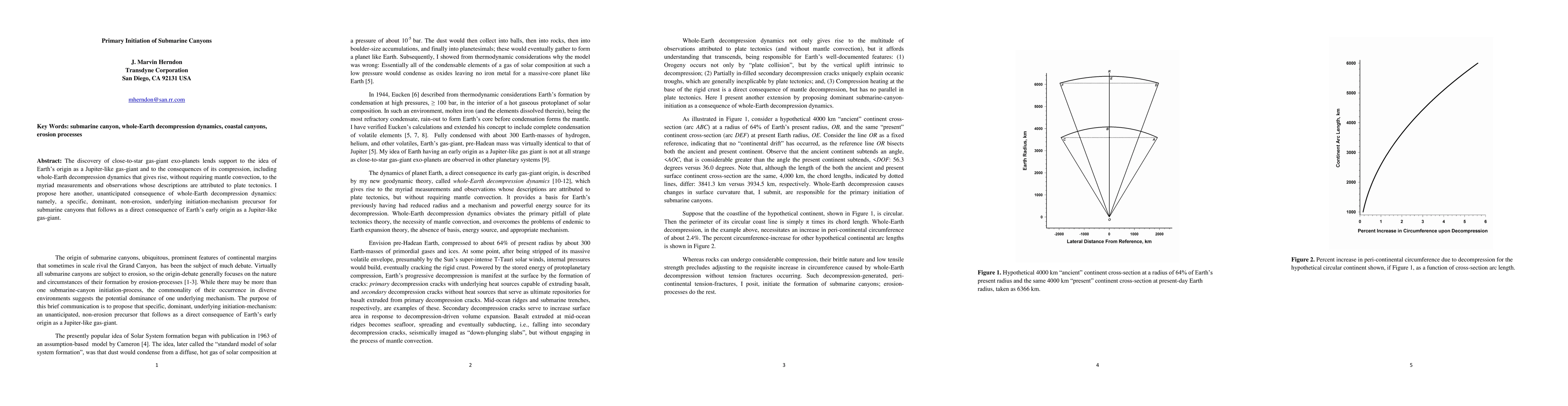 The discovery of close-to-star gas-giant exo-planets lends support to the idea of Earth's origin as a Jupiter-like gas-giant and to the consequences of its compression, including whole-Earth decompression dynamics that gives rise, without requiring mantle convection, to the myriad measurements and observations whose descriptions are attributed to plate tectonics. I propose here another, unanticipated consequence of whole-Earth decompression dynamics: namely, a specific, dominant, non-erosion, underlying initiation-mechanism precursor for submarine canyons that follows as a direct consequence of Earth's early origin as a Jupiter-like gas-giant.