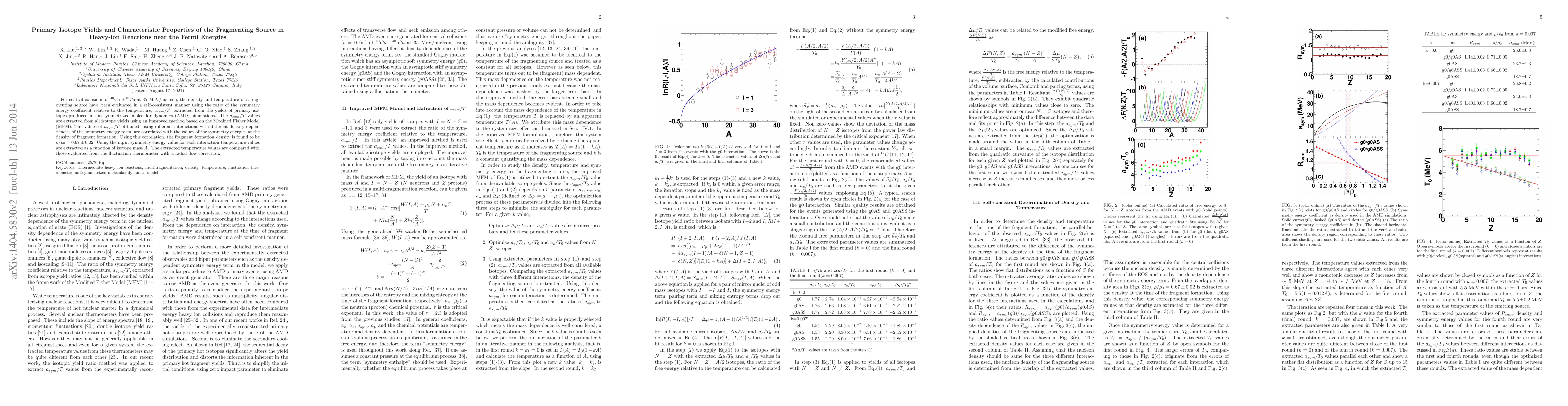 For central collisions of $^{40}$Ca $+ ^{40}$Ca at 35 MeV/nucleon, the density and temperature of a fragmenting source have been evaluated in a self-consistent manner using the ratio of the symmetry energy coefficient relative to the temperature, $a_{sym}/T$, extracted from the yields of primary isotopes produced in antisymmetrized molecular dynamics (AMD) simulations. The $a_{sym}/T$ values are extracted from all isotope yields using an improved method based on the Modified Fisher Model (MFM). The values of $a_{sym}/T$ obtained, using different interactions with different density dependencies of the symmetry energy term, are correlated with the values of the symmetry energies at the density of fragment formation. Using this correlation, the fragment formation density is found to be $\rho/\rho_0 = 0.67 \pm 0.02$. Using the input symmetry energy value for each interaction temperature values are extracted as a function of isotope mass $A$. The extracted temperature values are compared with those evaluated from the fluctuation thermometer with a radial flow correction.
