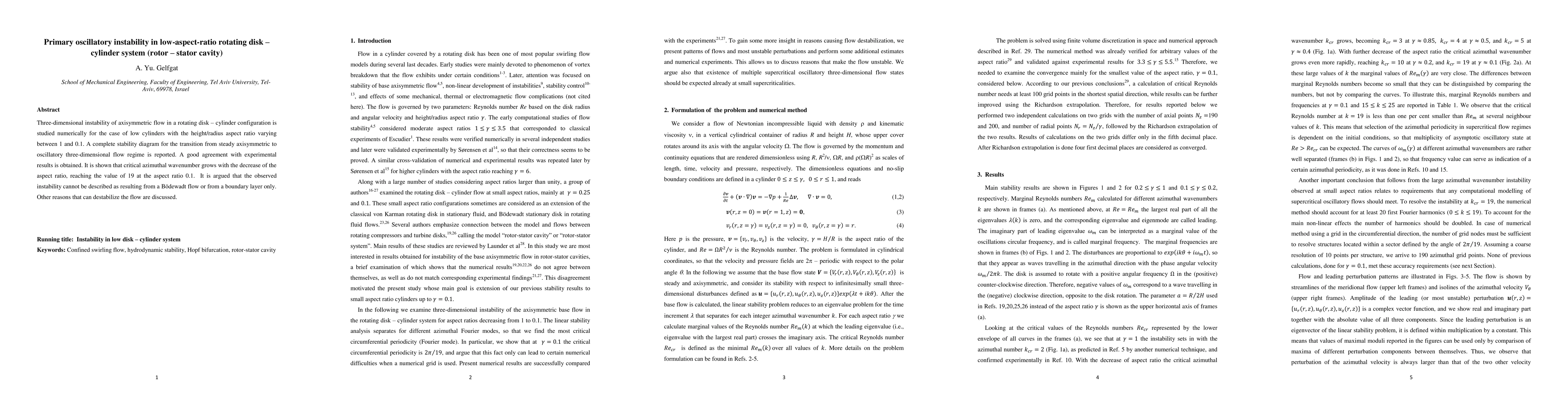 Three-dimensional instability of axisymmetric flow in a rotating disk - cylinder configuration is studied numerically for the case of low cylinders with the height/radius aspect ratio varying between 1 and 0.1. A complete stability diagram for the transition from steady axisymmetric to oscillatory three-dimensional flow regime is reported. A good agreement with experimental results is obtained. It is shown that critical azimuthal wavenumber grows with the decrease of the aspect ratio, reaching the value of 19 at the aspect ratio 0.1. It is argued that the observed instability cannot be described as resulting from a B\"odewadt flow or from a boundary layer only. Other reasons that can destabilize the flow are discussed.