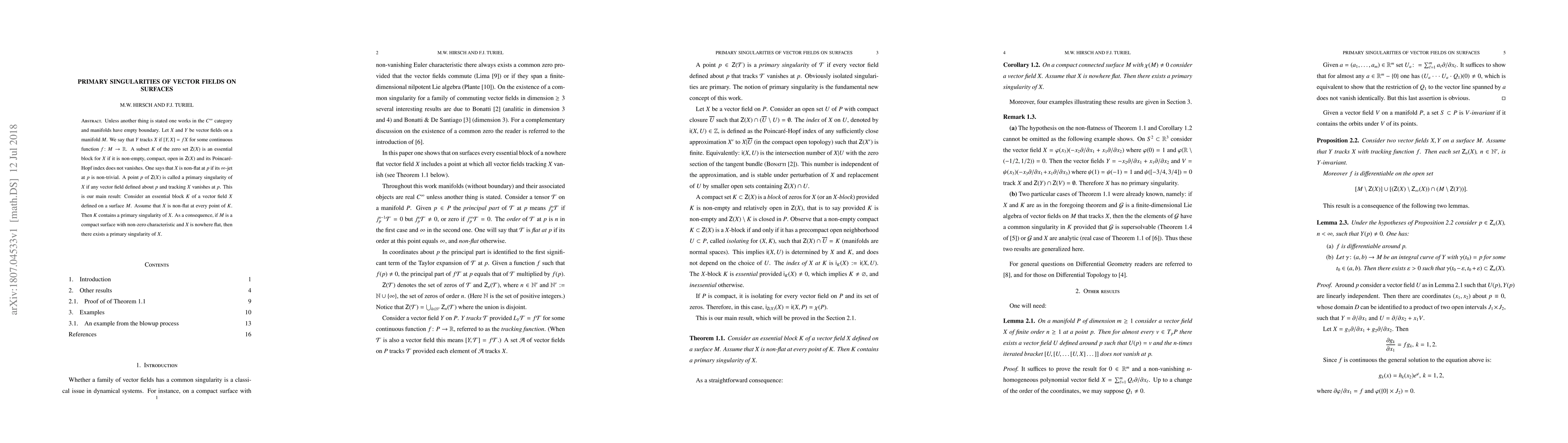Unless another thing is stated one works in the $C^\infty$ category and manifolds have empty boundary. Let $X$ and $Y$ be vector fields on a manifold $M$. We say that $Y$ tracks $X$ if $[Y,X]=fX$ for some continuous function $f\colon M\rightarrow\mathbb R$. A subset $K$ of the zero set ${\mathsf Z}(X)$ is an essential block for $X$ if it is non-empty, compact, open in ${\mathsf Z}(X)$ and its Poincar\'e-Hopf index does not vanishes. One says that $X$ is non-flat at $p$ if its $\infty$-jet at $p$ is non-trivial. A point $p$ of ${\mathsf Z}(X)$ is called a primary singularity of $X$ if any vector field defined about $p$ and tracking $X$ vanishes at $p$. This is our main result: Consider an essential block $K$ of a vector field $X$ defined on a surface $M$. Assume that $X$ is non-flat at every point of $K$. Then $K$ contains a primary singularity of $X$. As a consequence, if $M$ is a compact surface with non-zero characteristic and $X$ is nowhere flat, then there exists a primary singularity of $X$.