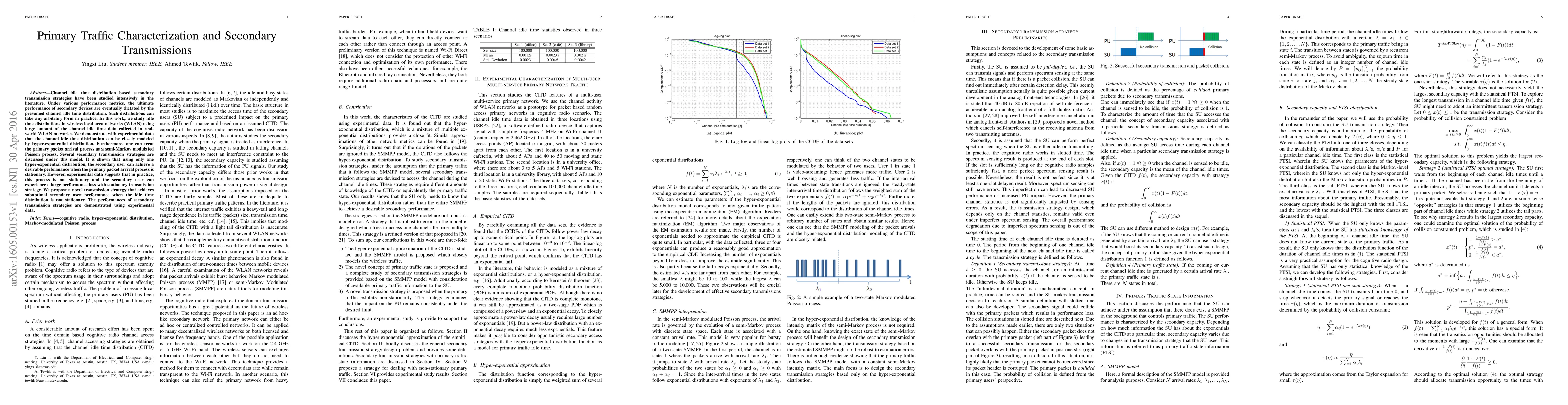 Researchers studied channel idle time distributions in wireless local area networks using real-world data and found that a hyper-exponential distribution closely models these distributions. They proposed a new transmission strategy to improve secondary user performance when the idle time distribution is not stationary.