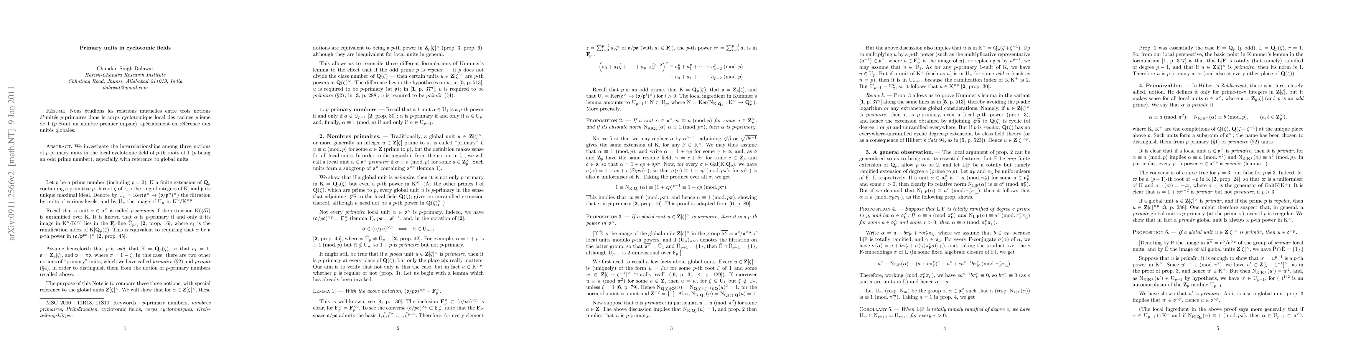 We investigate the interrelationships of three notions of primary units in the local cyclotomic field of $p$-th roots of~1($p$ being an odd prime number), especially with reference to global units.