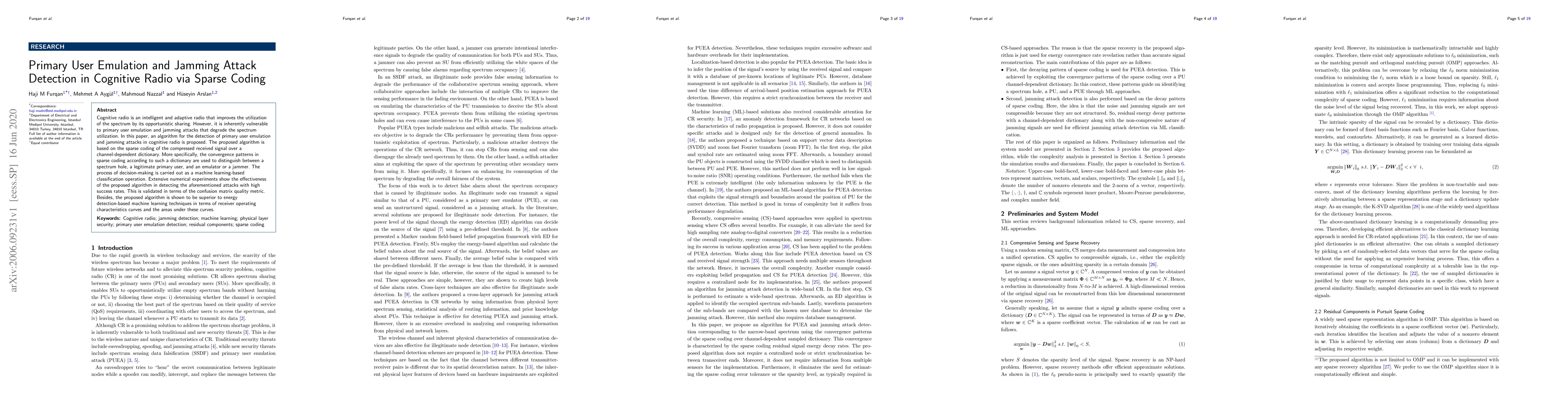 A new algorithm detects primary user emulation and jamming attacks in cognitive radio using sparse coding and machine learning, achieving high success rates in numerical experiments.