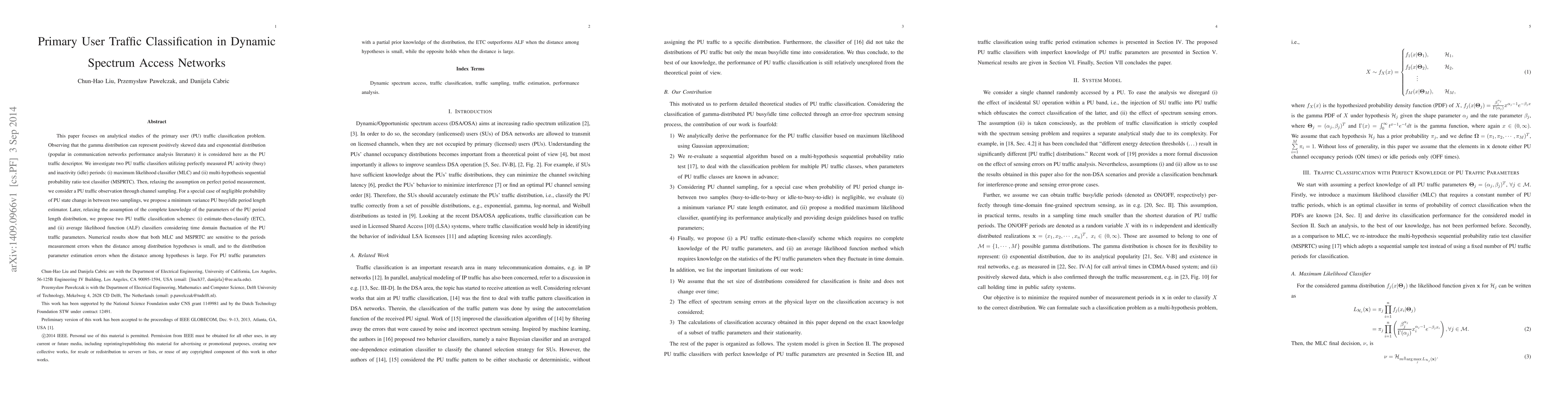 This paper focuses on analytical studies of the primary user (PU) traffic classification problem. Observing that the gamma distribution can represent positively skewed data and exponential distribution (popular in communication networks performance analysis literature) it is considered here as the PU traffic descriptor. We investigate two PU traffic classifiers utilizing perfectly measured PU activity (busy) and inactivity (idle) periods: (i) maximum likelihood classifier (MLC) and (ii) multi-hypothesis sequential probability ratio test classifier (MSPRTC). Then, relaxing the assumption on perfect period measurement, we consider a PU traffic observation through channel sampling. For a special case of negligible probability of PU state change in between two samplings, we propose a minimum variance PU busy/idle period length estimator. Later, relaxing the assumption of the complete knowledge of the parameters of the PU period length distribution, we propose two PU traffic classification schemes: (i) estimate-then-classify (ETC), and (ii) average likelihood function (ALF) classifiers considering time domain fluctuation of the PU traffic parameters. Numerical results show that both MLC and MSPRTC are sensitive to the periods measurement errors when the distance among distribution hypotheses is small, and to the distribution parameter estimation errors when the distance among hypotheses is large. For PU traffic parameters with a partial prior knowledge of the distribution, the ETC outperforms ALF when the distance among hypotheses is small, while the opposite holds when the distance is large.
