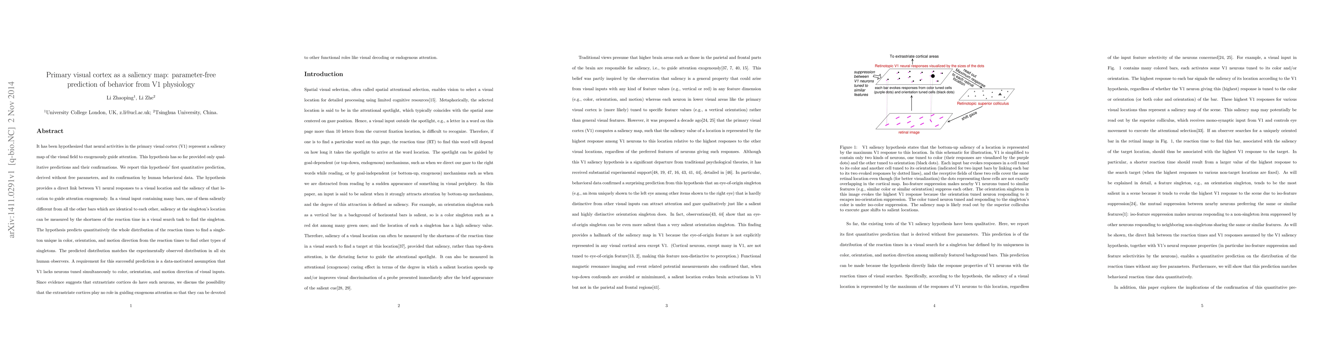 This paper quantitatively predicts human behavioral responses in visual search tasks based on the primary visual cortex's (V1) neural activity, proposing that V1 functions as a saliency map guiding exogenous attention. The prediction, derived without free parameters, matches observed reaction times for finding unique visual stimuli in various experiments.