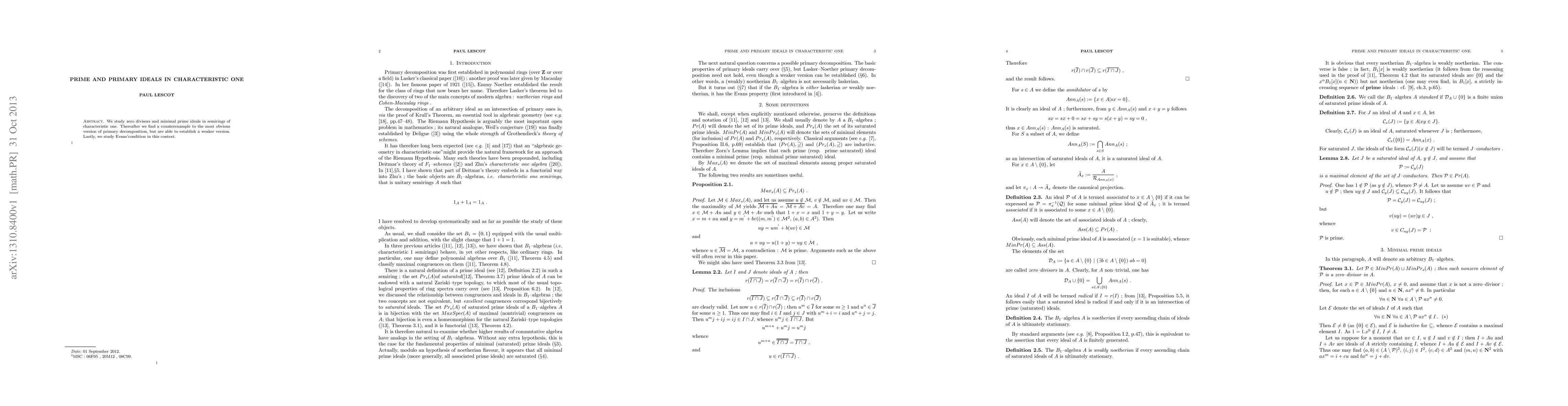 We study zero divisors and minimal prime ideals in semirings of characteristic one. Thereafter we find a counterexample to the most obvious version of primary decomposition, but are able to establish a weaker version. Lastly, we study Evans'condition in this context.