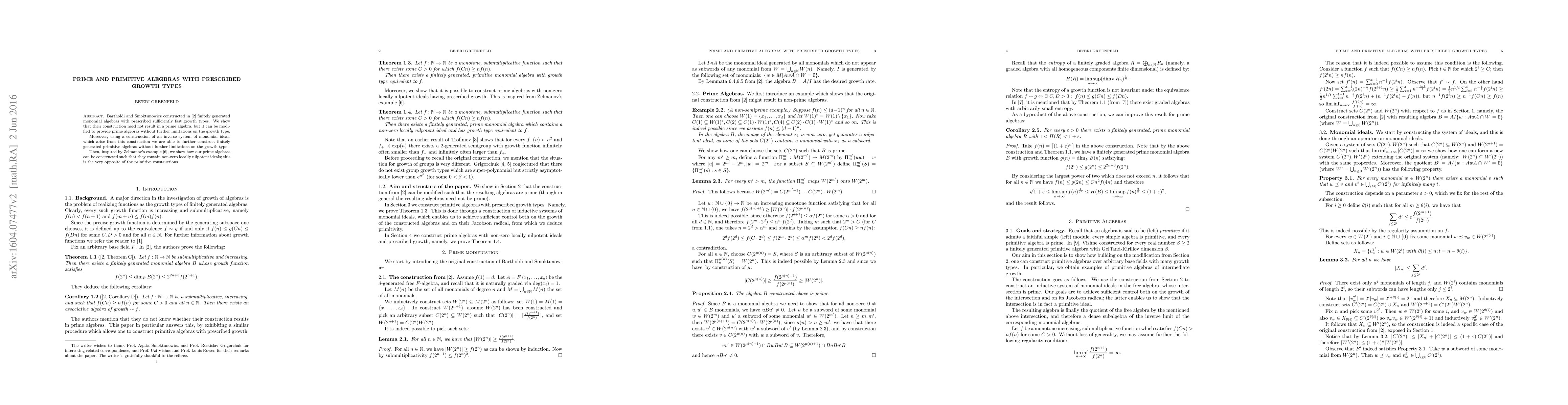 Bartholdi and Smoktunowicz constructed finitely generated monomial algebras with prescribed sufficiently fast growth types. We show that their construction need not result in a prime algebra, but it can be modified to provide prime algebras without further limitations on the growth type. Moreover, using a construction of an inverse system of monomial ideals which arise from this construction we are able to further construct finitely generated primitive algebras with many regular enough growth types. Then, inspired by an example by Zelmanov, we show how our prime algebras can be constructed such that they contain non-zero locally nilpotent ideals; this is the very opposite of the primitive constructions.