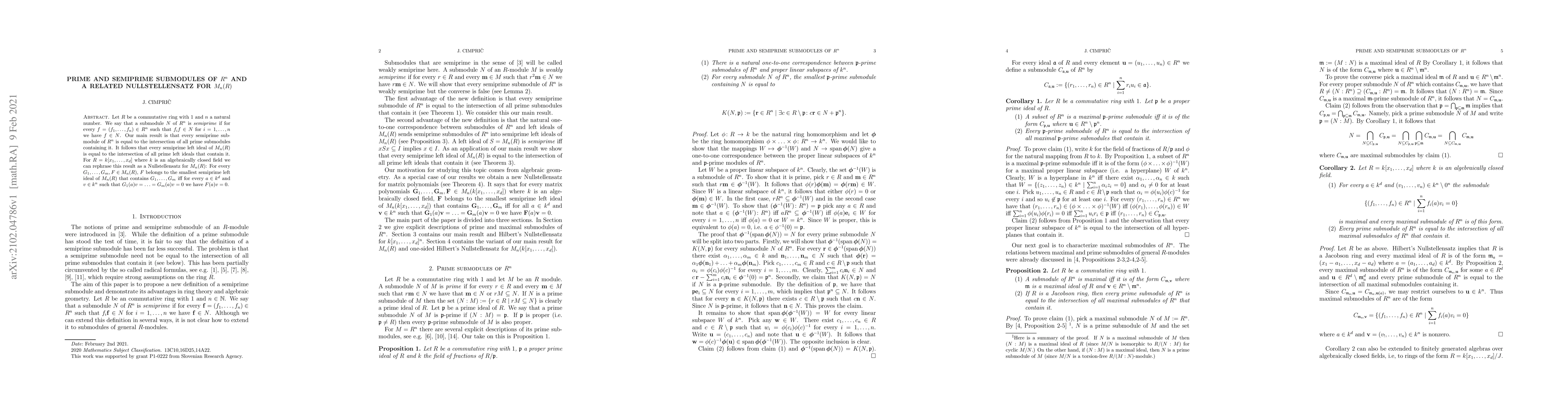 Let $R$ be a commutative ring with $1$ and $n$ a natural number. We say that a submodule $N$ of $R^n$ is semiprime if for every $f=(f_1,\ldots,f_n) \in R^n$ such that $f_i f \in N$ for $i=1,\ldots,n$ we have $f \in N$. Our main result is that every semiprime submodule of $R^n$ is equal to the intersection of all prime submodules containing it. It follows that every semiprime left ideal of $M_n(R)$ is equal to the intersection of all prime left ideals that contain it. For $R=k[x_1,\ldots,x_d]$ where $k$ is an algebraically closed field we can rephrase this result as a Nullstellensatz for $M_n(R)$: For every $G_1,\ldots,G_m,F \in M_n(R)$, $F$ belongs to the smallest semiprime left ideal of $M_n(R)$ that contains $G_1,\ldots,G_m$ iff for every $a \in k^d$ and $v \in k^n$ such that $G_1(a)v=\ldots=G_m(a)v=0$ we have $F(a)v=0$.