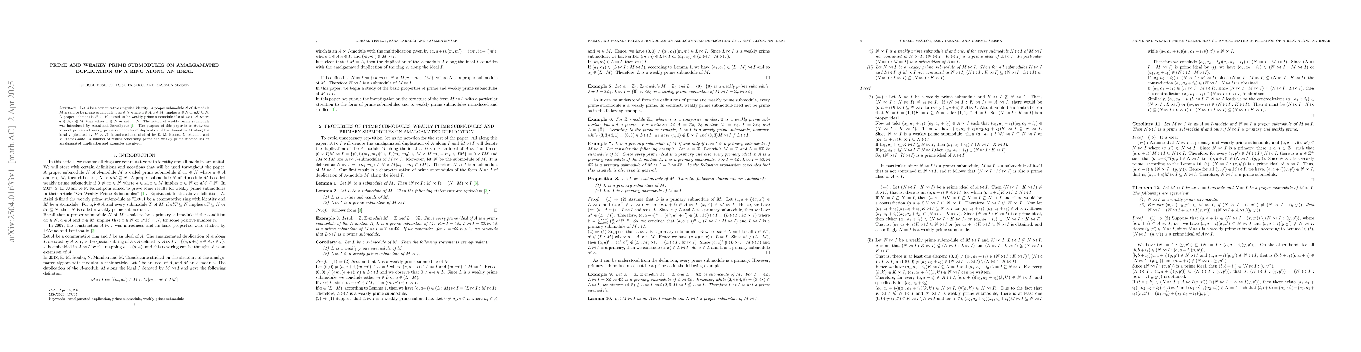 The paper introduces and examines the characteristics of prime and weakly prime submodules within the amalgamated duplication of A-modules, extending previous work on weakly prime submodules.
