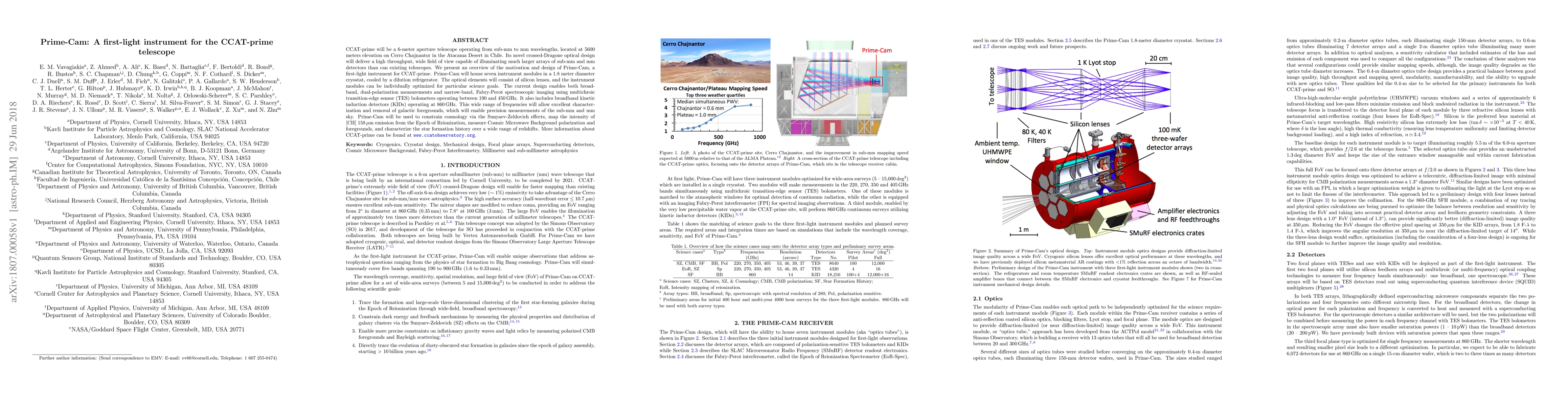 Prime-Cam is a first-light instrument for the CCAT-prime telescope, designed for sub-mm to mm wavelengths, featuring a high throughput, wide field of view, and multichroic TES bolometers and KIDs for precision sky measurements. It aims to study cosmology, reionization, and star formation history.