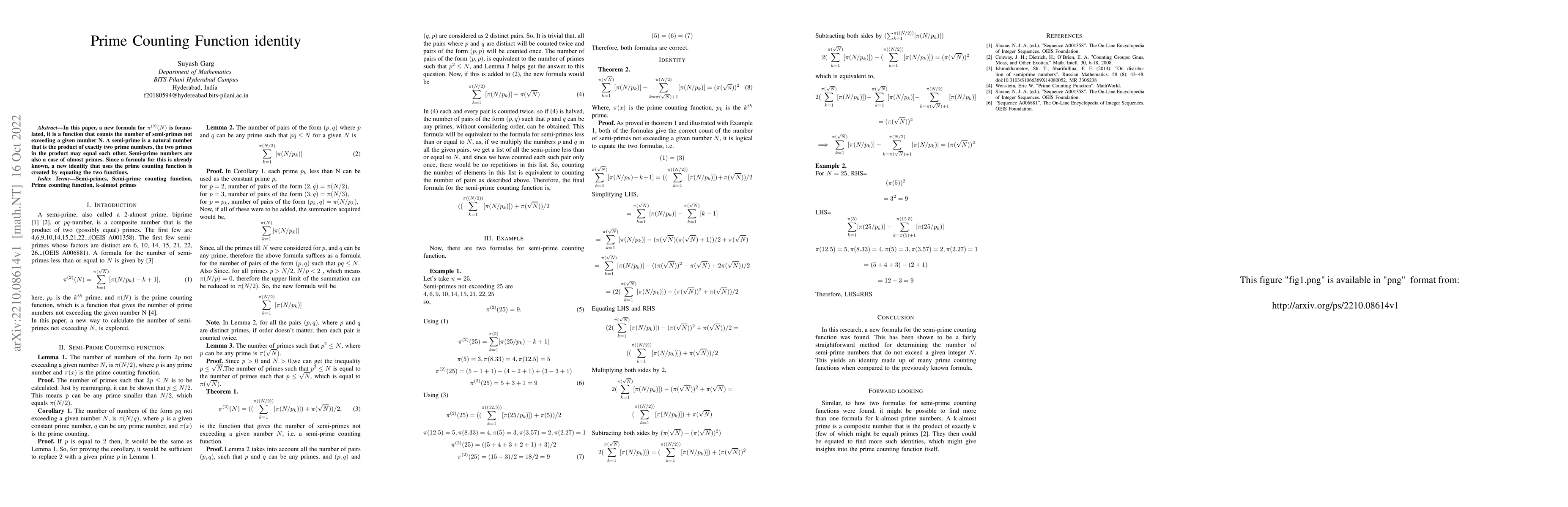 This paper introduces a novel formula for π^(2)(N), which counts the number of semi-primes up to a given number N. It establishes a new identity by equating this semi-prime counting function with the prime counting function.