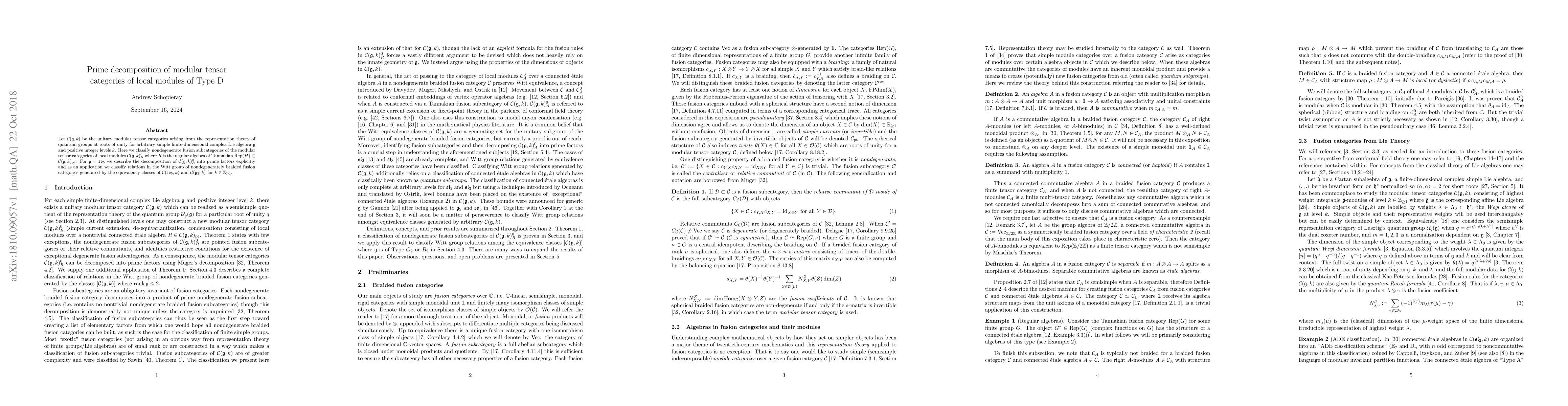 Let $\mathcal{C}(\mathfrak{g},k)$ be the unitary modular tensor categories arising from the representation theory of quantum groups at roots of unity for arbitrary simple finite-dimensional complex Lie algebra $\mathfrak{g}$ and positive integer levels $k$. Here we classify nondegenerate fusion subcategories of the modular tensor categories of local modules $\mathcal{C}(\mathfrak{g},k)_R^0$ where $R$ is the regular algebra of Tannakian $\text{Rep}(H)\subset\mathcal{C}(\mathfrak{g},k)_\text{pt}$. For $\mathfrak{g}=\mathfrak{so}_5$ we describe the decomposition of $\mathcal{C}(\mathfrak{g},k)_R^0$ into prime factors explicitly and as an application we classify relations in the Witt group of nondegenerately braided fusion categories generated by the equivalency classes of $\mathcal{C}(\mathfrak{so}_5,k)$ and $\mathcal{C}(\mathfrak{g}_2,k)$ for $k\in\mathbb{Z}_{\geq1}$.