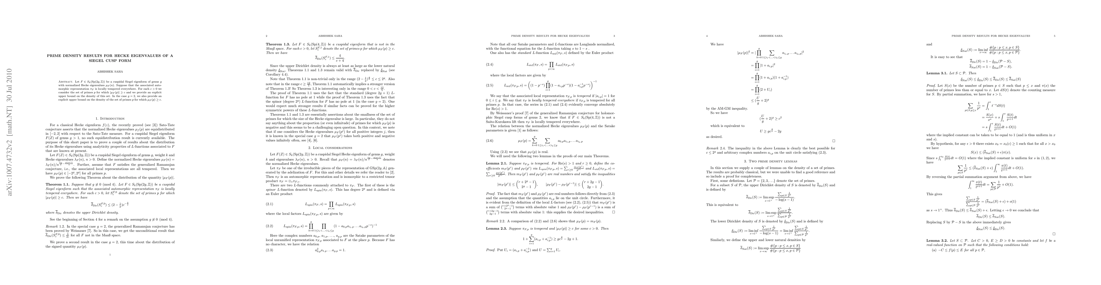 Let F in S_k(Sp(2g, Z)) be a cuspidal Siegel eigenform of genus g with normalized Hecke eigenvalues mu_F(n). Suppose that the associated automorphic representation pi_F is locally tempered everywhere. For each c>0 we consider the set of primes p for which |mu_F(p)| >= c and we provide an explicit upper bound on the density of this set. In the case g=2, we also provide an explicit upper bound on the density of the set of primes p for which mu_F(p) >= c.