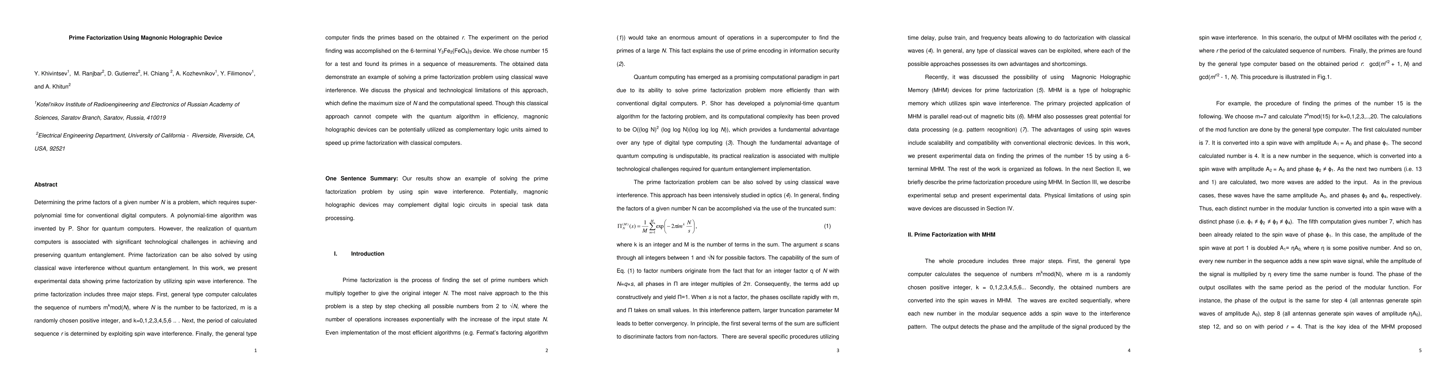 This paper presents an experimental demonstration of prime factorization using spin wave interference in a magnonic holographic device, bypassing quantum entanglement. The process involves three steps: calculating sequences, determining the period via spin wave interference, and identifying primes with a general computer. The method shows promise as a complementary solution to enhance prime factorization in classical computing, despite its limitations in efficiency compared to quantum algorithms.