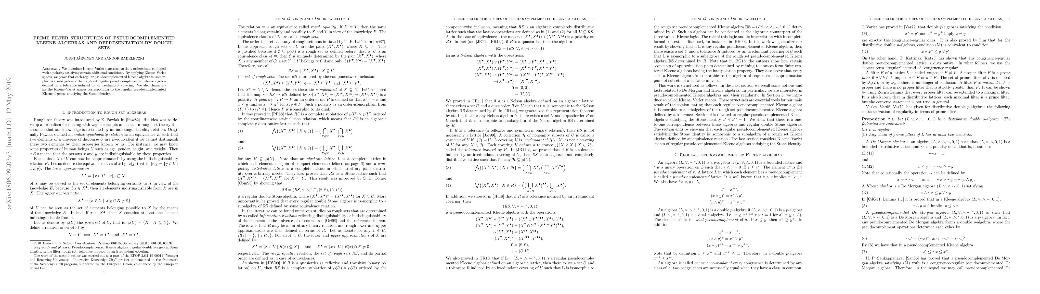 Summary: This paper introduces Kleene-Varlet spaces to show that regular pseudocomplemented Kleene algebras can be represented as subalgebras in rough set regular pseudocomplemented Kleene algebras derived from irredundant coverings, and it characterizes these spaces under the Stone identity.
