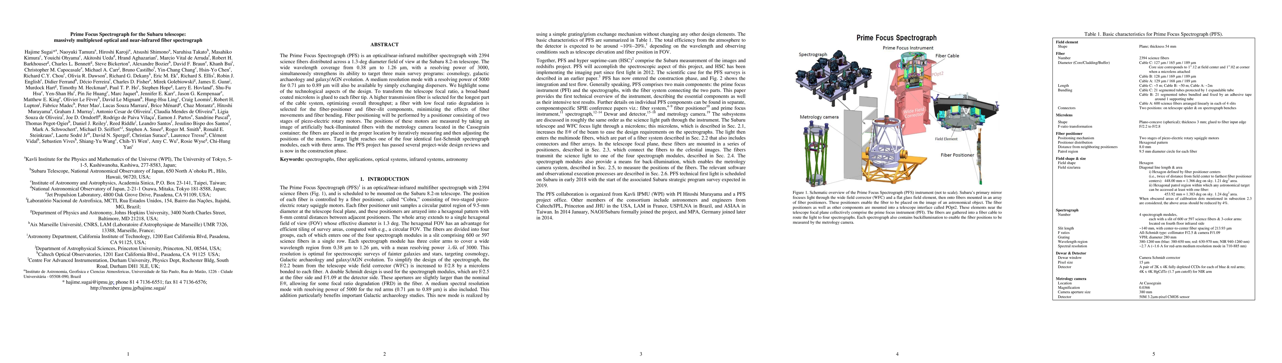 The Prime Focus Spectrograph (PFS) for the Subaru telescope is a highly multiplexed optical/near-infrared spectrograph with 2394 fibers, designed to cover wavelengths from 0.38 to 1.26 μm and support cosmology, galactic archaeology, and galaxy/AGN evolution surveys. The PFS employs advanced fiber positioning and high-throughput design to optimize its performance.