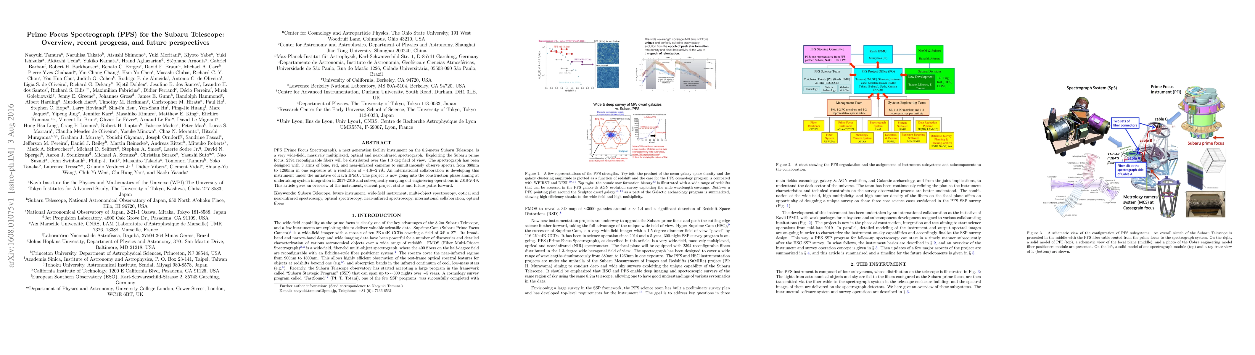 The Prime Focus Spectrograph (PFS) on the Subaru Telescope is a next-generation, wide-field spectrograph designed to observe spectra from 380nm to 1260nm using 2394 reconfigurable fibers. The project is in its construction phase, with integration planned for 2017-2018 and engineering operations for 2018-2019.