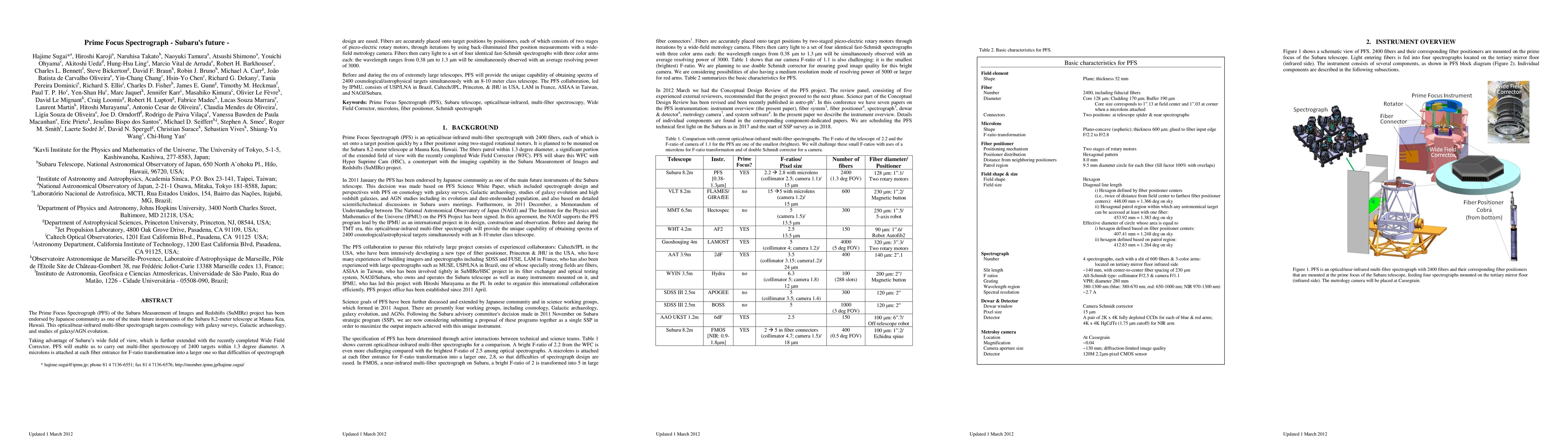 The Prime Focus Spectrograph (PFS) of the Subaru Measurement of Images and Redshifts (SuMIRe) project has been endorsed by Japanese community as one of the main future instruments of the Subaru 8.2-meter telescope at Mauna Kea, Hawaii. This optical/near-infrared multi-fiber spectrograph targets cosmology with galaxy surveys, Galactic archaeology, and studies of galaxy/AGN evolution. Taking advantage of Subaru's wide field of view, which is further extended with the recently completed Wide Field Corrector, PFS will enable us to carry out multi-fiber spectroscopy of 2400 targets within 1.3 degree diameter. A microlens is attached at each fiber entrance for F-ratio transformation into a larger one so that difficulties of spectrograph design are eased. Fibers are accurately placed onto target positions by positioners, each of which consists of two stages of piezo-electric rotary motors, through iterations by using back-illuminated fiber position measurements with a wide-field metrology camera. Fibers then carry light to a set of four identical fast-Schmidt spectrographs with three color arms each: the wavelength ranges from 0.38 {\mu}m to 1.3 {\mu}m will be simultaneously observed with an average resolving power of 3000. Before and during the era of extremely large telescopes, PFS will provide the unique capability of obtaining spectra of 2400 cosmological/astrophysical targets simultaneously with an 8-10 meter class telescope. The PFS collaboration, led by IPMU, consists of USP/LNA in Brazil, Caltech/JPL, Princeton, & JHU in USA, LAM in France, ASIAA in Taiwan, and NAOJ/Subaru.