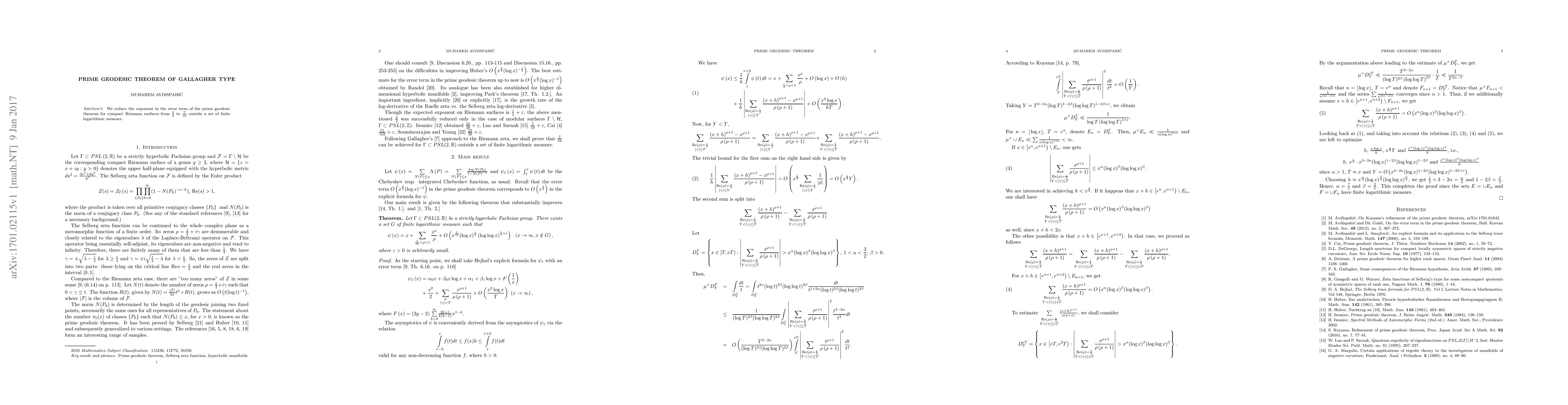 Summary: This paper improves the prime geodesic theorem for compact Riemann surfaces by reducing the error term exponent from $\frac{3}{4}$ to $\frac{7}{10}$ for almost all cases, excluding a set of finite logarithmic measure.