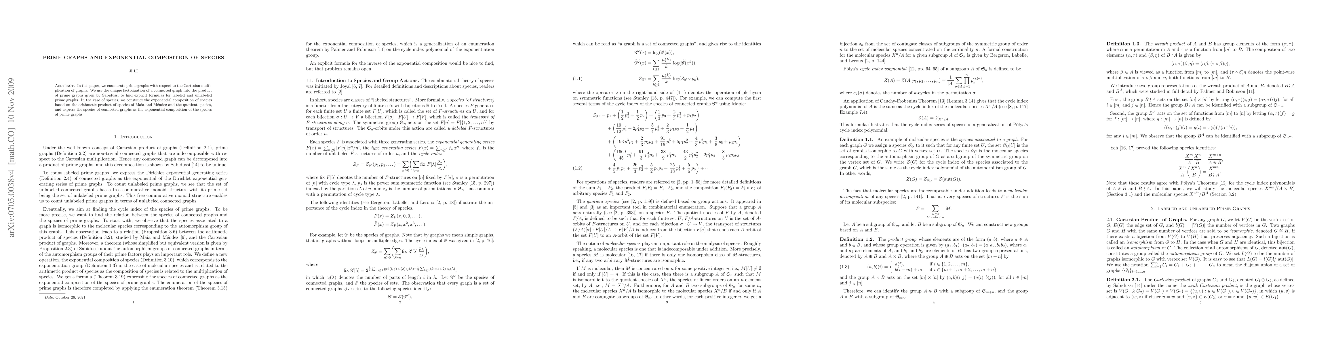 This paper enumerates prime graphs through Cartesian multiplication and derives explicit formulas for labeled and unlabeled prime graphs. It also constructs the exponential composition of species based on arithmetic products, expressing connected graph species as the exponential composition of prime graph species.