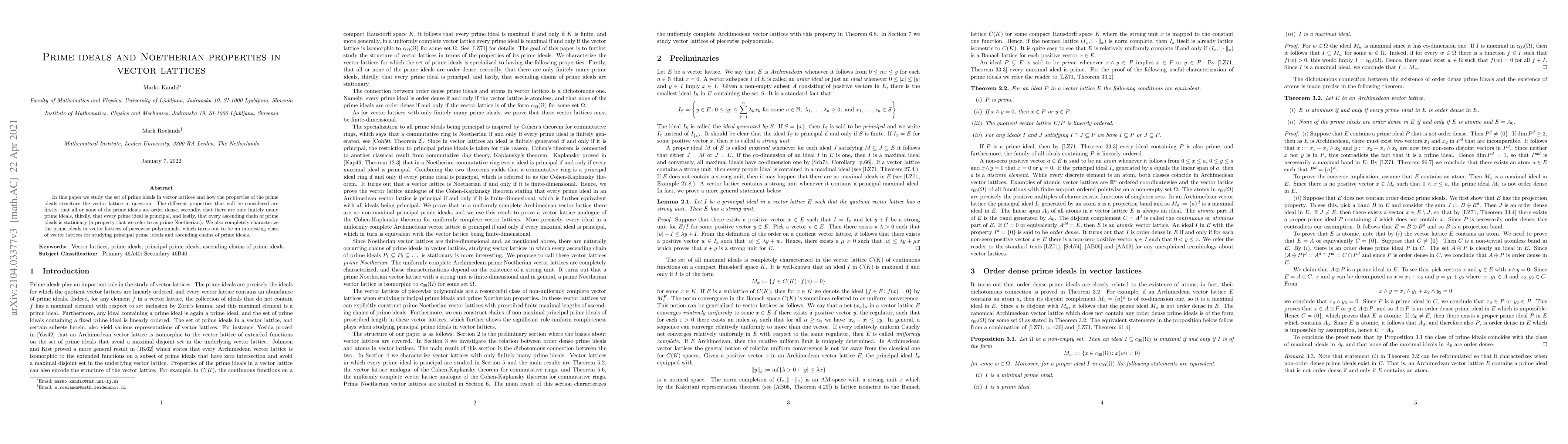 This paper explores prime ideals in vector lattices, focusing on their density, finiteness, and Noetherian properties, including the stationarity of ascending chains. It particularly characterizes prime ideals in vector lattices of piecewise polynomials.