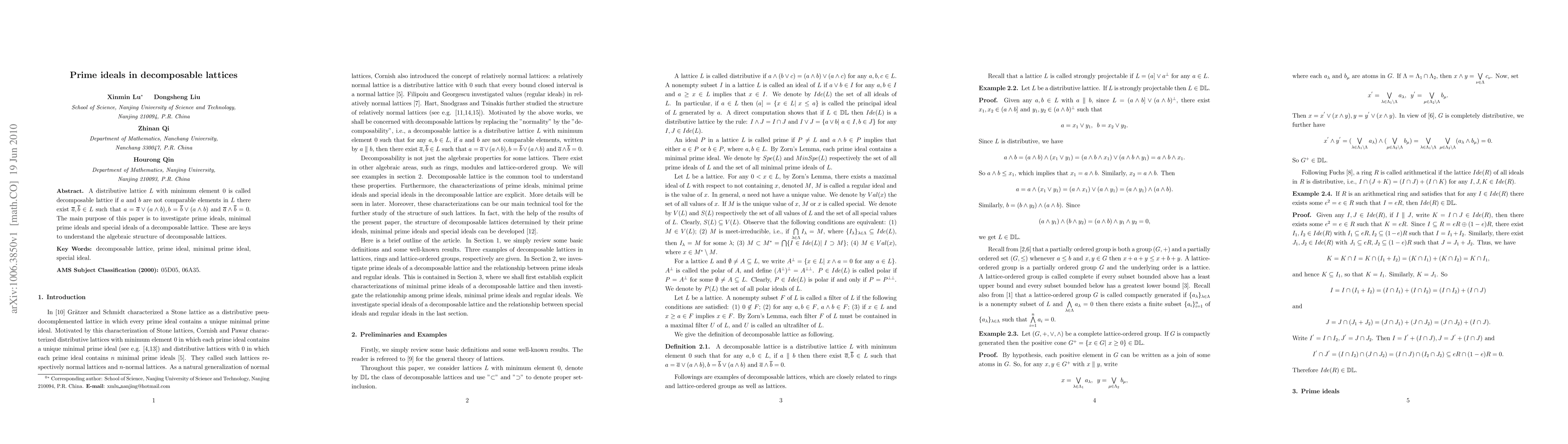 This paper explores prime ideals, minimal prime ideals, and special ideals within decomposable lattices, aiming to uncover the algebraic structure of these lattices. The study focuses on the relationships between elements and their decomposition properties.