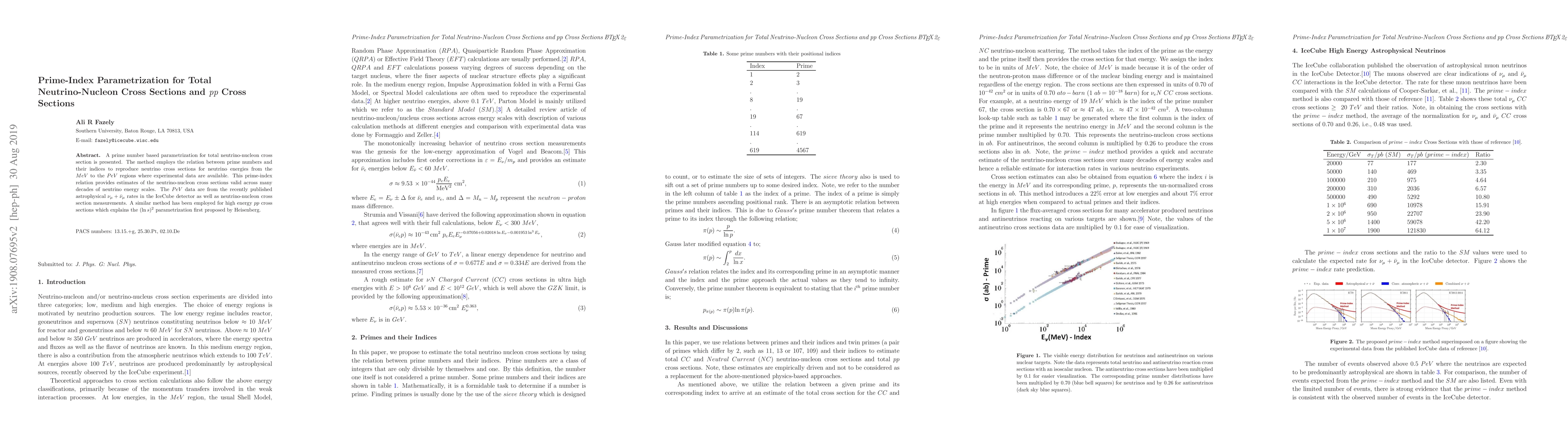 This paper introduces a prime-index parametrization for estimating total neutrino-nucleon and $pp$ cross sections, utilizing the relationship between prime numbers and their indices. This method accurately reproduces cross sections across neutrino energies from MeV to PeV, incorporating recent astrophysical data from the IceCube detector.