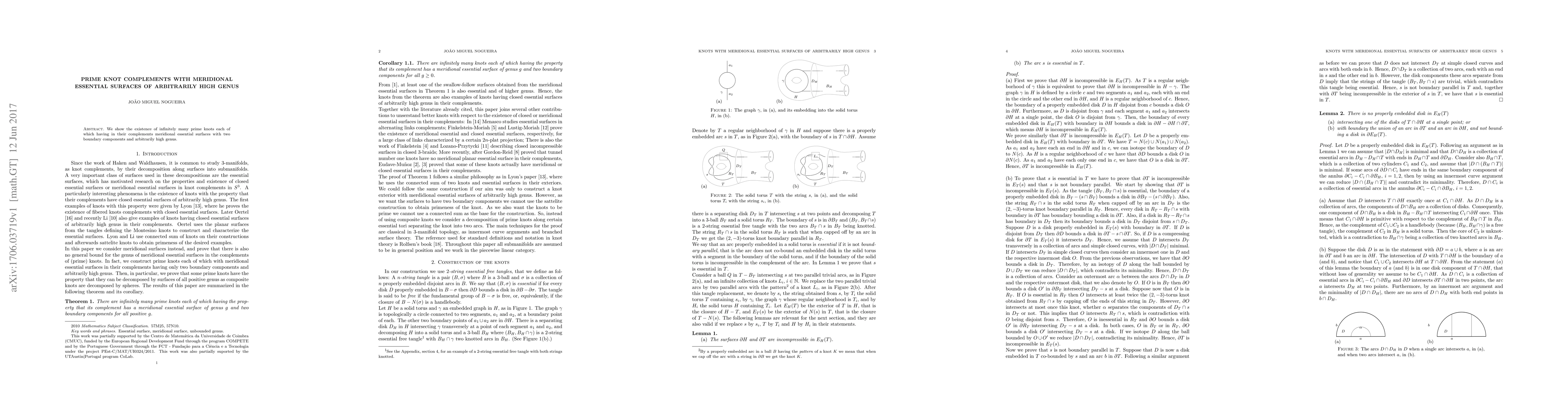 Summary: The paper demonstrates the existence of infinitely many prime knots whose complements contain meridional essential surfaces with two boundary components and can exhibit arbitrarily high genus. This highlights a significant structural property of prime knot complements.
