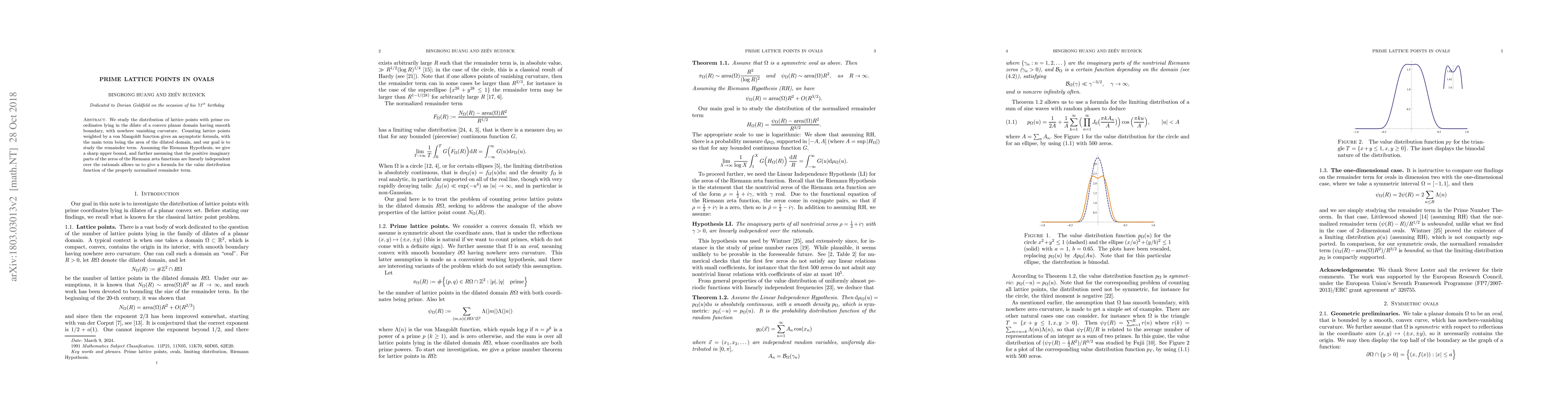 This paper investigates the distribution of prime lattice points within a dilated convex planar domain with smooth boundary, deriving an asymptotic formula for the count weighted by a von Mangoldt function. It provides a sharp upper bound for the remainder term under the Riemann Hypothesis and a formula for the value distribution of the normalized remainder term if the positive imaginary parts of the Riemann zeta's zeros are linearly independent over the rationals.