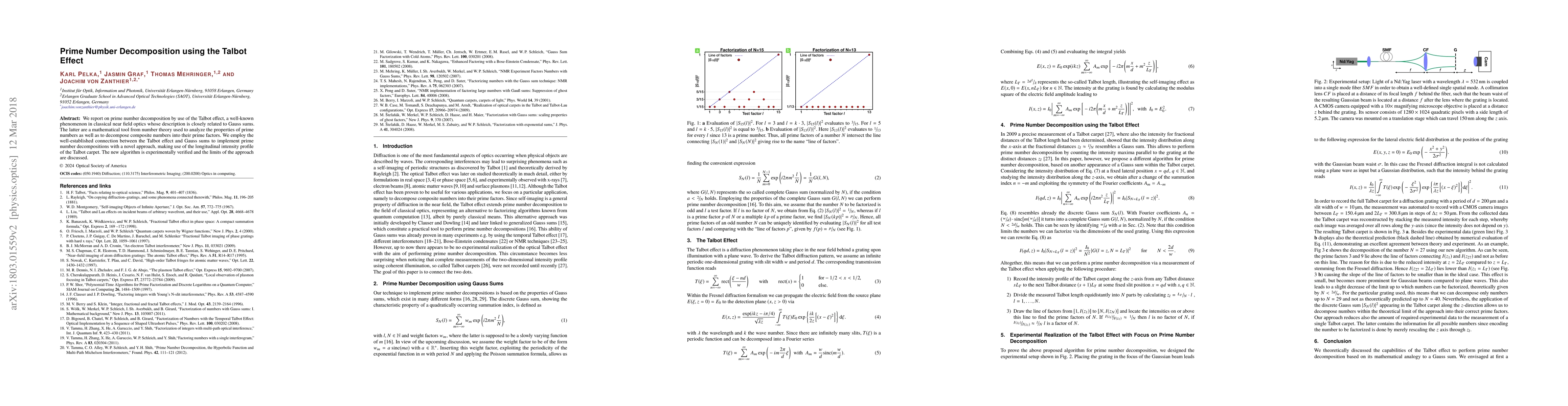 We report on prime number decomposition by use of the Talbot effect, a well-known phenomenon in classical near field optics whose description is closely related to Gauss sums. The latter are a mathematical tool from number theory used to analyze the properties of prime numbers as well as to decompose composite numbers into their prime factors. We employ the well-established connection between the Talbot effect and Gauss sums to implement prime number decompositions with a novel approach, making use of the longitudinal intensity profile of the Talbot carpet. The new algorithm is experimentally verified and the limits of the approach are discussed.