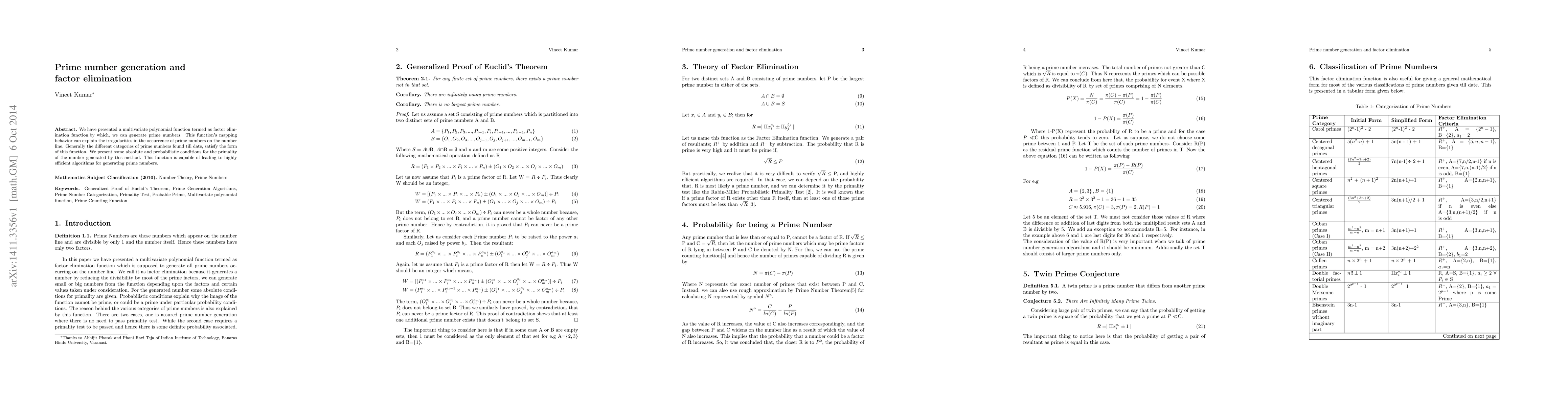 We have presented a multivariate polynomial function termed as factor elimination function,by which, we can generate prime numbers. This function's mapping behavior can explain the irregularities in the occurrence of prime numbers on the number line. Generally the different categories of prime numbers found till date, satisfy the form of this function. We present some absolute and probabilistic conditions for the primality of the number generated by this method. This function is capable of leading to highly efficient algorithms for generating prime numbers.