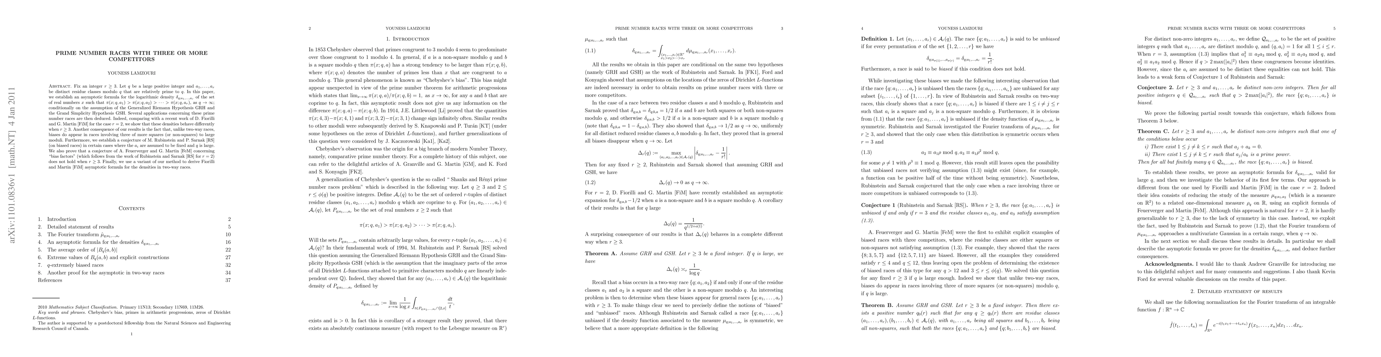 This paper establishes an asymptotic formula for the logarithmic density of prime number races involving three or more residue classes, conditionally on GRH and GSH. It shows that biases appear in races with three or more competitors, unlike two-way races, and disproves a conjecture for "bias factors" when $r\geq 3$.
