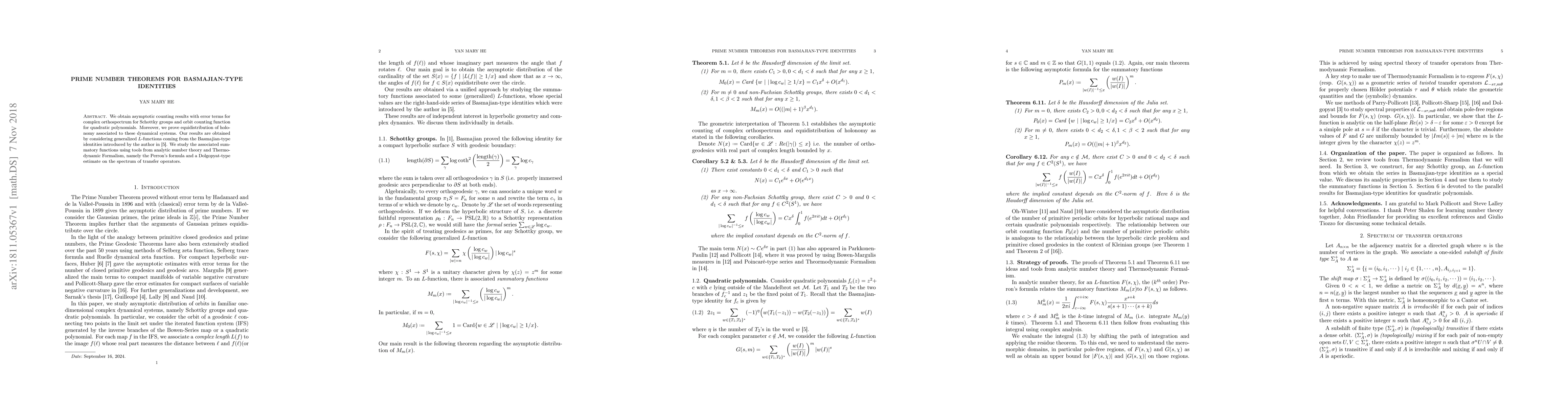 We obtain asymptotic counting results with error terms for complex orthospectrum for Schottky groups and orbit counting function for quadratic polynomials. Moreover, we prove equidistribution of holonomy associated to these dynamical systems. Our results are obtained by considering generalized $L$-functions coming from the Basmajian-type identities introduced by the author in \cite{He}. We study the associated summatory functions using tools from analytic number theory and Thermodynamic Formalism, namely the Perron's formula and a Dolgopyat-type estimate on the spectrum of transfer operators.