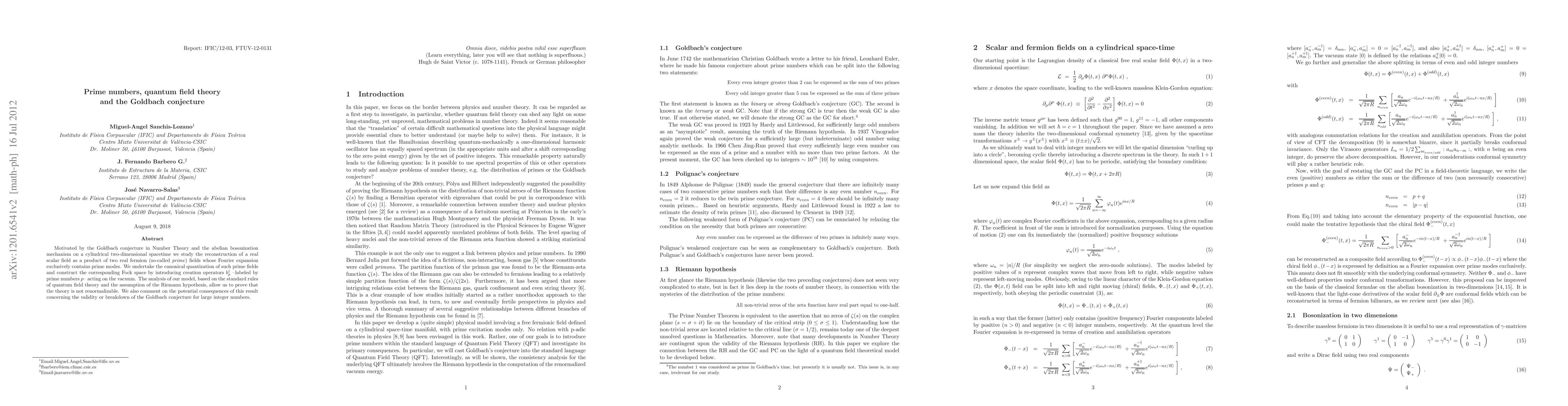 Motivated by the Goldbach conjecture in Number Theory and the abelian bosonization mechanism on a cylindrical two-dimensional spacetime we study the reconstruction of a real scalar field as a product of two real fermion (so-called \textit{prime}) fields whose Fourier expansion exclusively contains prime modes. We undertake the canonical quantization of such prime fields and construct the corresponding Fock space by introducing creation operators $b_{p}^{\dag}$ --labeled by prime numbers $p$-- acting on the vacuum. The analysis of our model, based on the standard rules of quantum field theory and the assumption of the Riemann hypothesis, allow us to prove that the theory is not renormalizable. We also comment on the potential consequences of this result concerning the validity or breakdown of the Goldbach conjecture for large integer numbers.