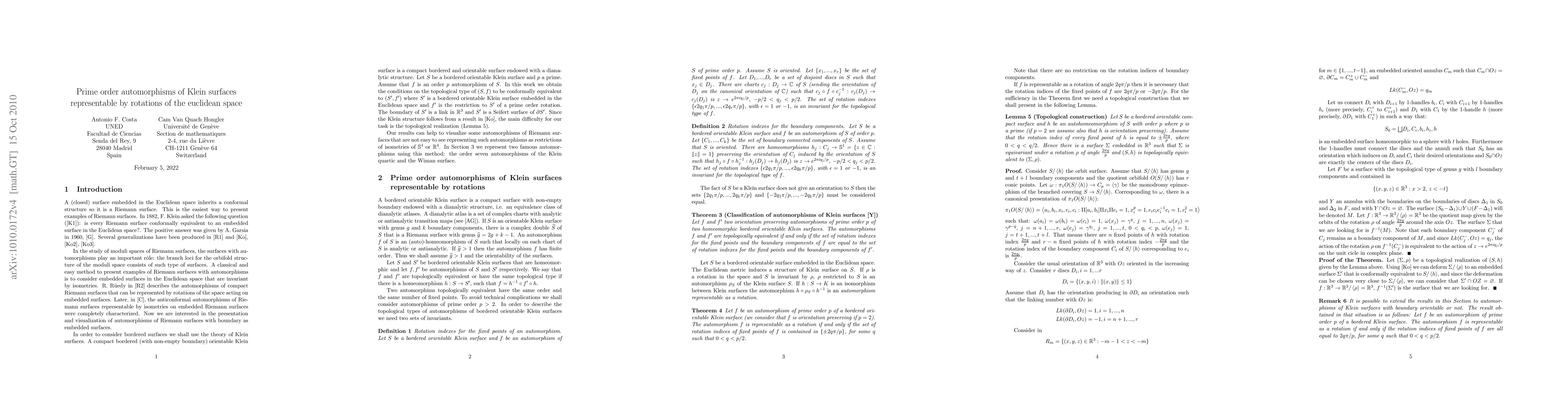 Let S be a bordered orientable Klein surface and p a prime. Assume that f is an order p automorphism of S. In this work we obtain the conditions on the topological type of (S,f) to be conformally equivalent to (S',f') where S' is a bordered orientable Klein surface embedded in the Euclidean space and f' is the restriction to S' of a prime order rotation. We represent two famous automorphisms using rotations of R^4 and S^4 : the order seven automorphisms of the Klein quartic and the Wiman surface.