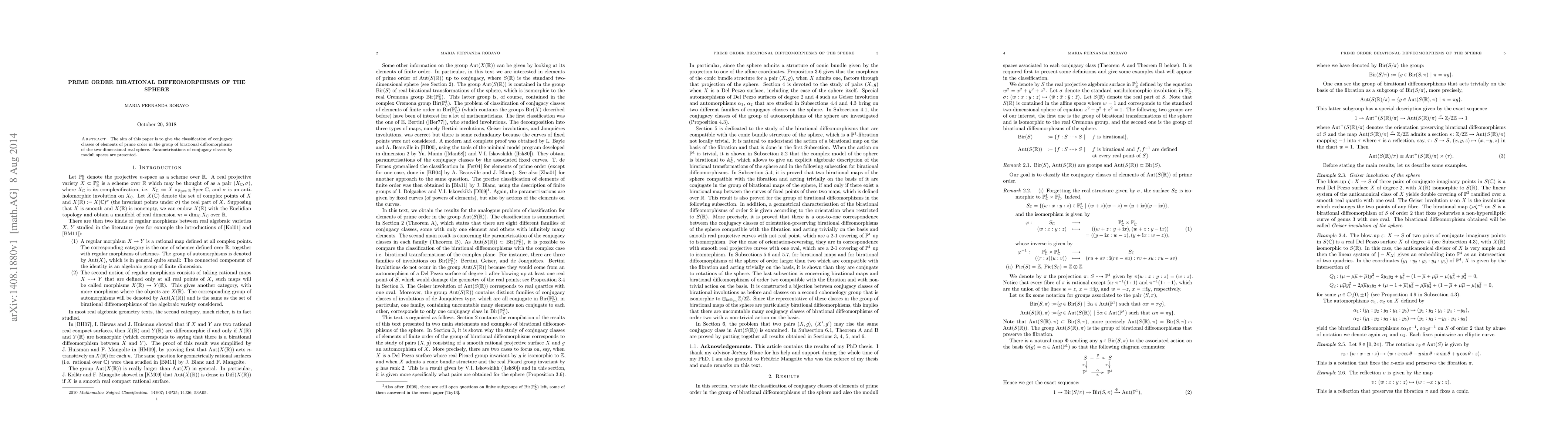 This paper classifies the conjugacy classes of elements of prime order in the group of birational diffeomorphisms of the 2D real sphere, providing a classification and parametrisations by moduli spaces.