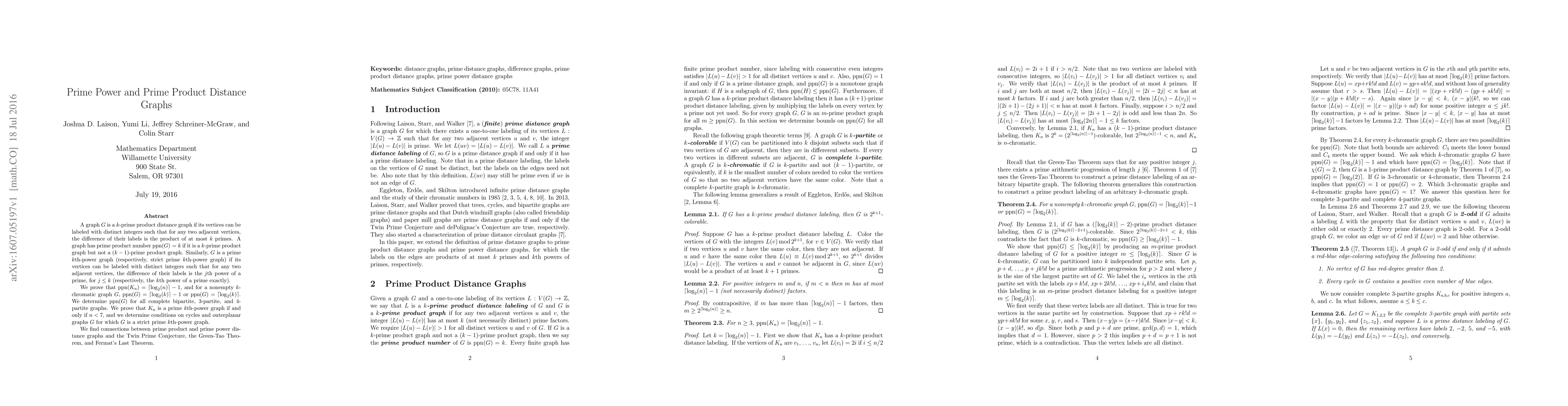 A graph $G$ is a $k$-prime product distance graph if its vertices can be labeled with distinct integers such that for any two adjacent vertices, the difference of their labels is the product of at most $k$ primes. A graph has prime product number $ppn(G)=k$ if it is a $k$-prime product graph but not a $(k-1)$-prime product graph. Similarly, $G$ is a prime $k$th-power graph (respectively, strict prime $k$th-power graph) if its vertices can be labeled with distinct integers such that for any two adjacent vertices, the difference of their labels is the $j$th power of a prime, for $j \leq k$ (respectively, the $k$th power of a prime exactly). We prove that $ppn(K_n) = \lceil \log_2(n)\rceil - 1$, and for a nonempty $k$-chromatic graph $G$, $ppn(G) = \lceil \log_2(k)\rceil - 1$ or $ppn(G) = \lceil \log_2(k)\rceil$. We determine $ppn(G)$ for all complete bipartite, 3-partite, and 4-partite graphs. We prove that $K_n$ is a prime $k$th-power graph if and only if $n < 7$, and we determine conditions on cycles and outerplanar graphs $G$ for which $G$ is a strict prime $k$th-power graph. We find connections between prime product and prime power distance graphs and the Twin Prime Conjecture, the Green-Tao Theorem, and Fermat's Last Theorem.