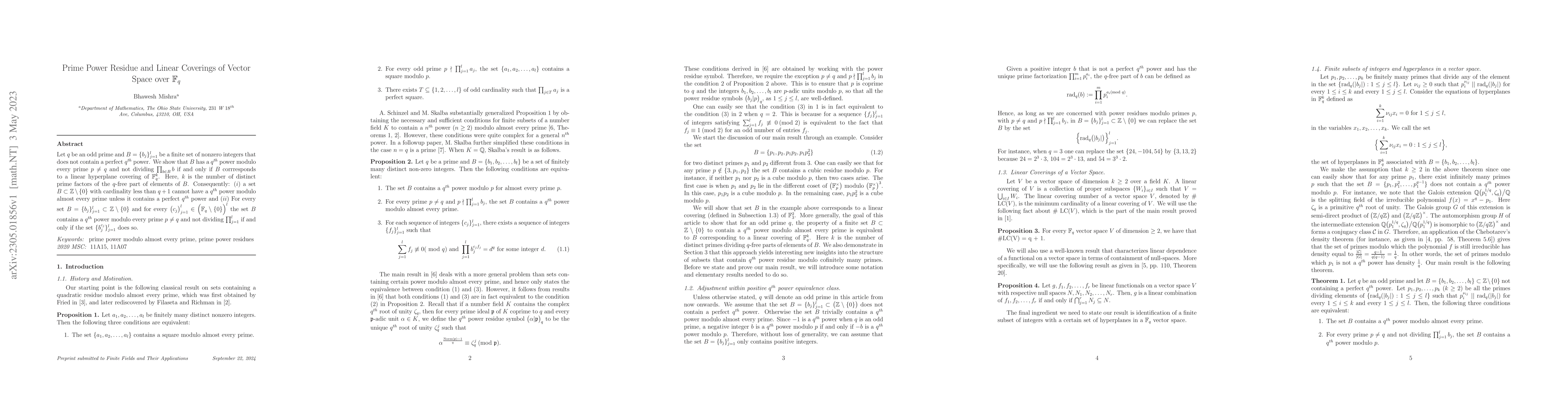 Let $q$ be an odd prime and $B = \{b_{j}\}_{j=1}^{l}$ be a finite set of nonzero integers that does not contain a perfect $q^{th}$ power. We show that $B$ has a $q^{th}$ power modulo every prime $p \neq q$ and not dividing $\prod_{b\in B} b$ if and only if $B$ corrresponds to a linear hyperplane covering of $\mathbb{F}_{q}^{k}$. Here, $k$ is the number of distinct prime factors of the $q$-free part of elements of $B$. Consequently: $(i)$ a set $B \subset\mathbb{Z}\setminus\{0\}$ with cardinality less than $q+1$ cannot have a $q^{th}$ power modulo almost every prime unless it contains a perfect $q^{th}$ power and $(ii)$ For every set $B = \{b_{j}\}_{j=1}^{l} \subset\mathbb{Z}\setminus\{0\}$ and for every $\big(c_{j}\big)_{j=1}^{l} \in\Big(\mathbb{F}_{q}\setminus\{0\}\Big)^{l}$ the set $B$ contains a $q^{th}$ power modulo every prime $p \neq q$ and not dividing $\prod_{j=1}^{l}$ if and only if the set $\{b_{j}^{c_{j}}\}_{j=1}^{l}$ does so.