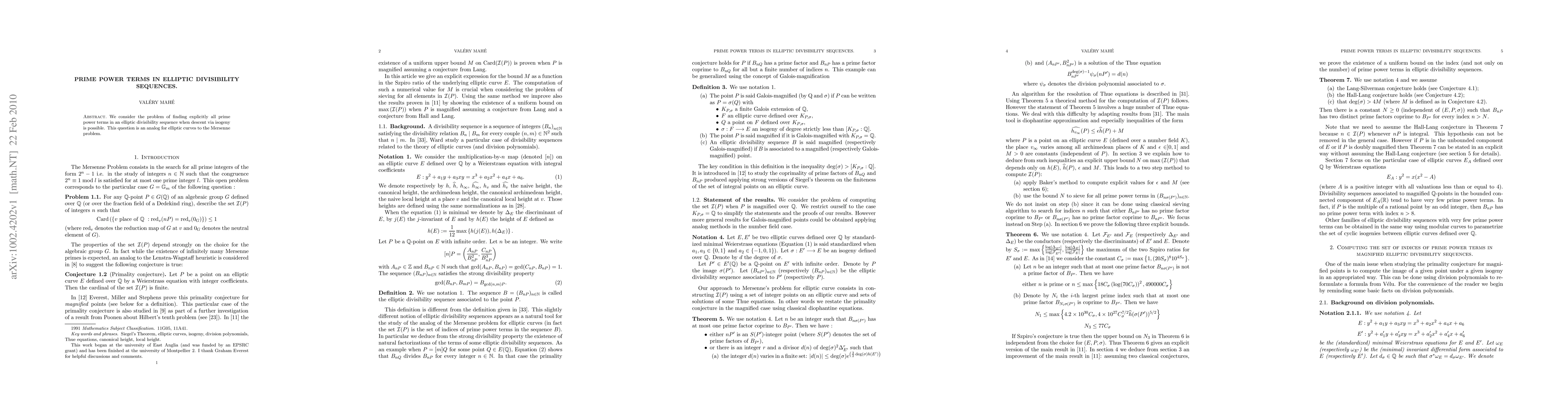 This paper explores prime power terms in elliptic divisibility sequences, analogizing the Mersenne problem to elliptic curves. It connects this problem to classical diophantine geometry and provides an explicit upper bound on the index of such terms in magnified sequences.