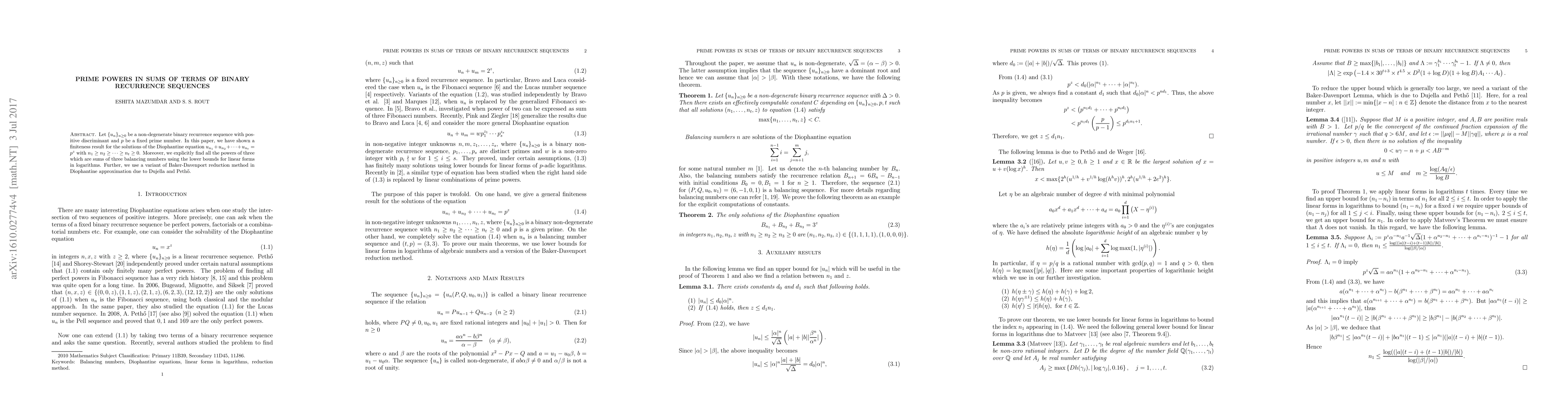 This paper establishes the finiteness of solutions to the Diophantine equation involving sums of terms from a binary recurrence sequence equal to a prime power under specific conditions. It also identifies all powers of three that can be represented as sums of three sequence terms, employing lower bounds for linear forms in logarithms and a Baker-Davenport reduction method.