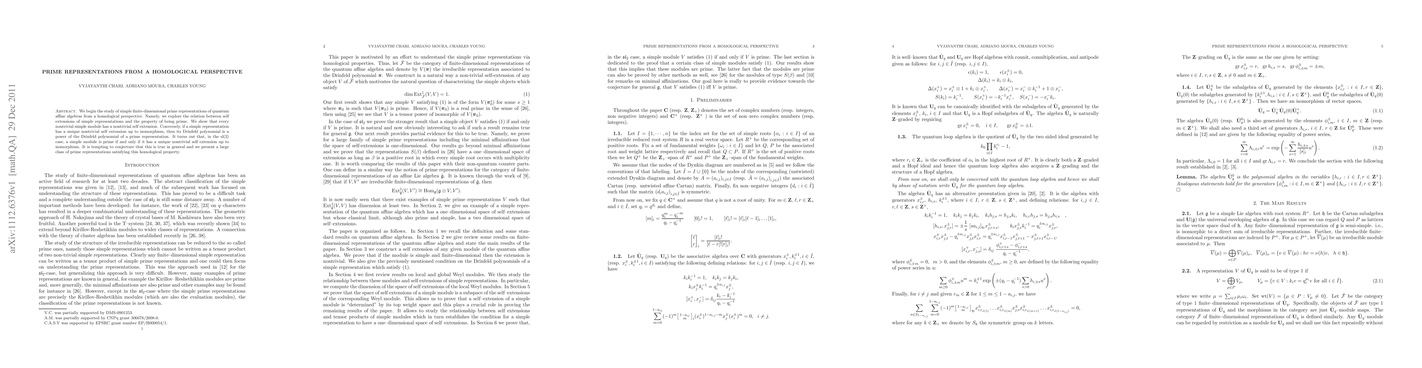 We begin the study of simple finite-dimensional prime representations of quantum affine algebras from a homological perspective. Namely, we explore the relation between self extensions of simple representations and the property of being prime. We show that every nontrivial simple module has a nontrivial self extension. Conversely, if a simple representation has a unique nontrivial self extension up to isomorphism, then its Drinfeld polynomial is a power of the Drinfeld polynomial of a prime representation. It turns out that, in the sl(2) case, a simple module is prime if and only if it has a unique nontrivial self extension up to isomorphism. It is tempting to conjecture that this is true in general and we present a large class of prime representations satisfying this homological property.