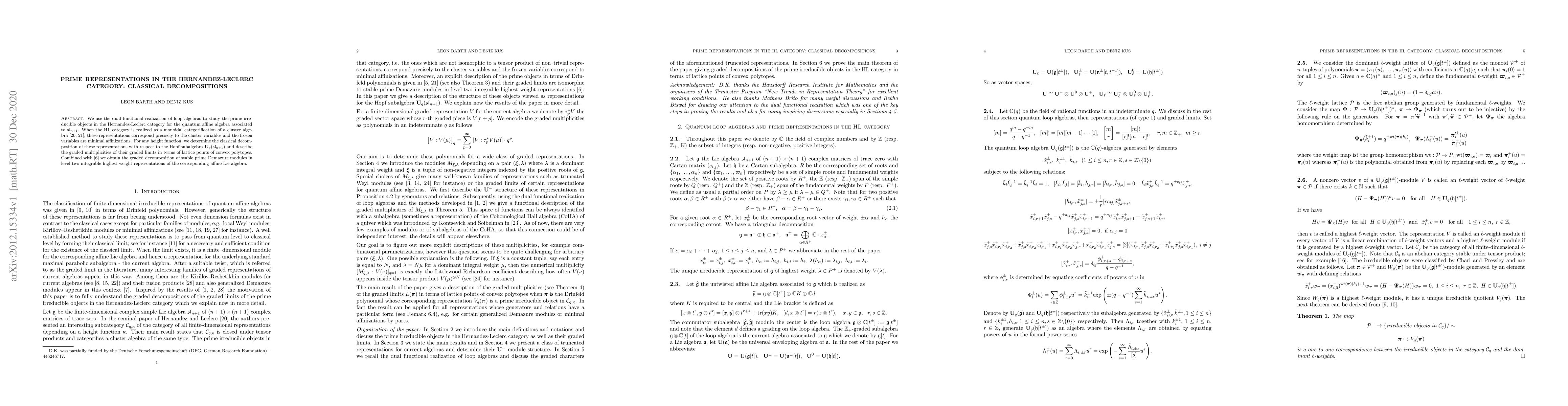 Researchers study prime irreducible objects in the Hernandez-Leclerc category using loop algebras and cluster algebra, finding classical decompositions with graded multiplicities that relate to lattice points of convex polytopes.