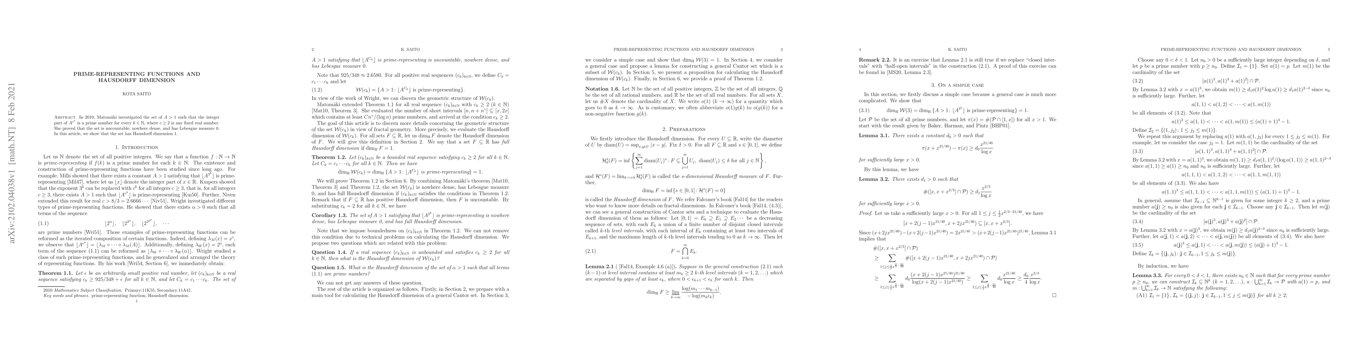 In 2010, Matom\"{a}ki investigated the set of $A>1$ such that the integer part of $ A^{c^k} $ is a prime number for every $k\in \mathbb{N}$, where $c\geq 2$ is any fixed real number. She proved that the set is uncountable, nowhere dense, and has Lebesgue measure $0$. In this article, we show that the set has Hausdorff dimension $1$.